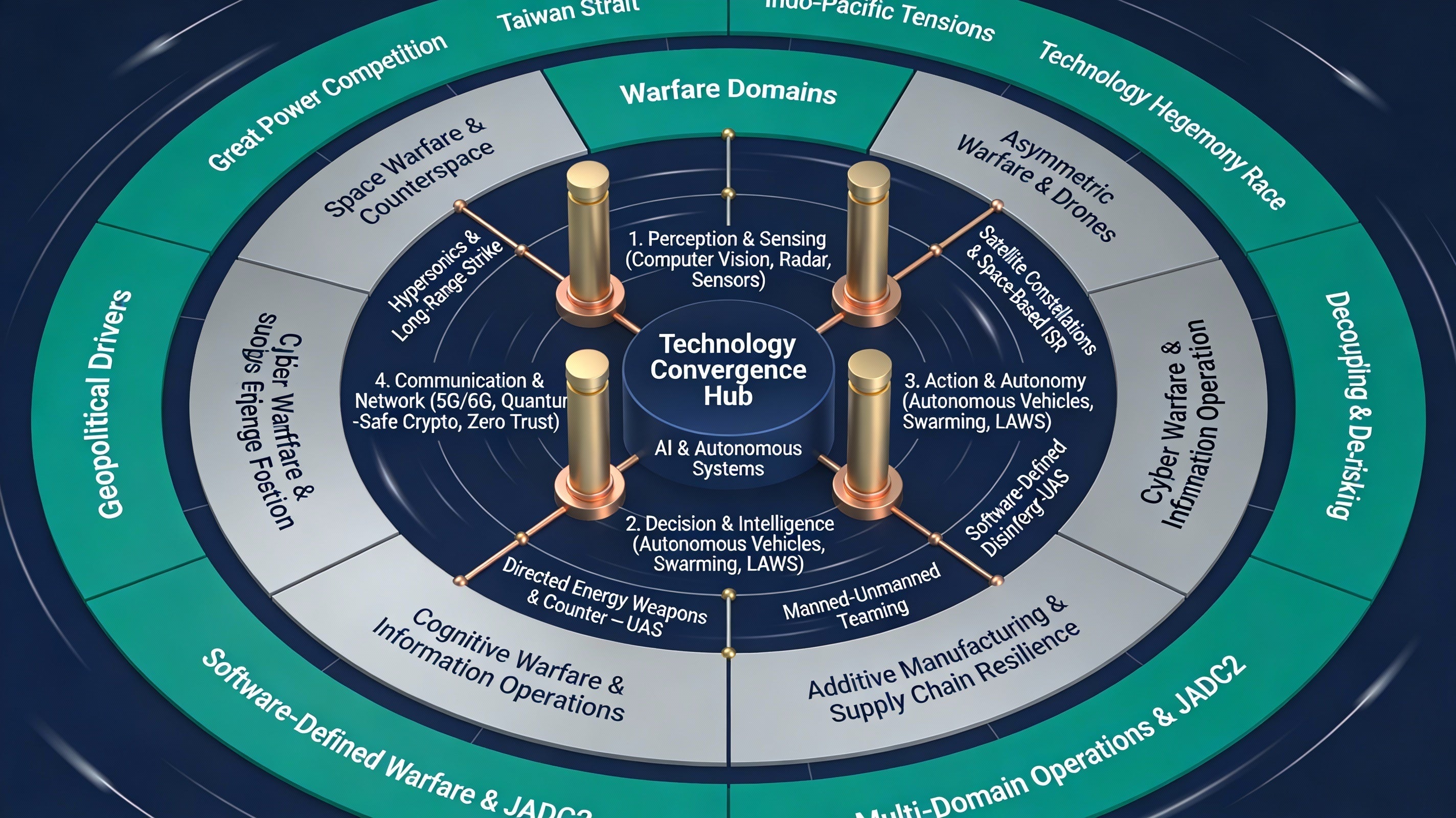 2030年に向けて、防衛テック領域は地政学的競争、技術覇権争い、軍事ドクトリンの急速な転換によって根本的に再編成されようとしている。本白書は、宇宙戦・非対称戦・コグニティブ領域の拡大、そしてAI・自律システム・デュアルユース技術の融合を視軸に、大国間競争の最前線で展開される84の重要テクノロジーを網羅した包括的地図を提供する。