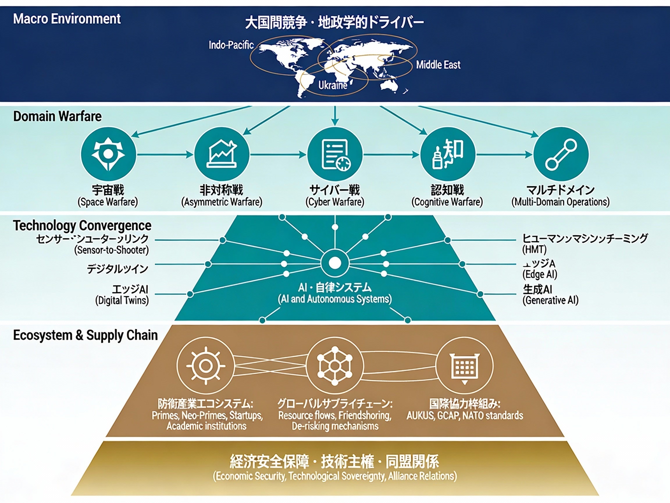 台湾海峡有事シナリオから弾薬不足という産業基盤の脆弱性まで、戦略環境と防衛産業の接点を具体的に分析することで、企業・研究機関・政策機構が直面する実装課題と機会を明らかにする。