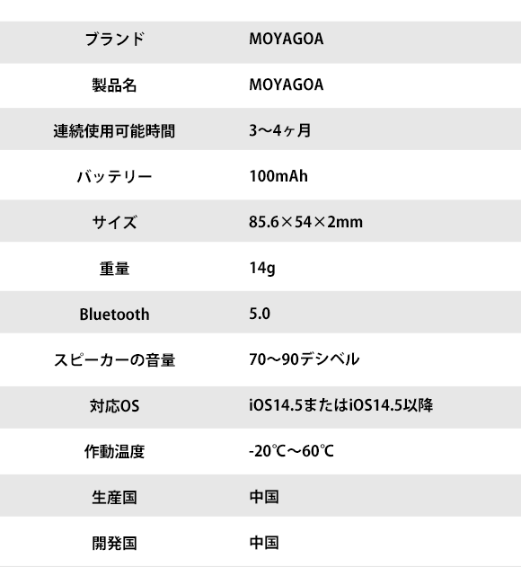 「MOYAGOA」はBluetooth5.0を採用し、従来のBluetooth4.2と比べると通信範囲は4倍、転送速度は2倍ほど向上し、より広い範囲でより素早く「MOYAGOA」を見つけることができます。