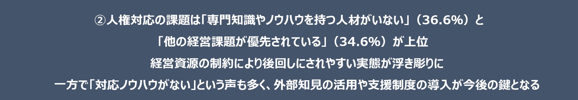 ②人権対応の課題は「専門知識やノウハウを持つ人材がいない」(36.6%)と
