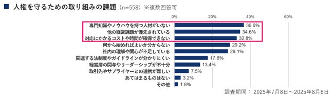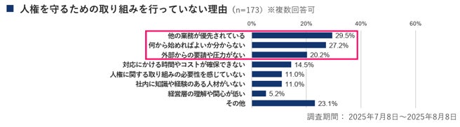 人権を守るための取り組みを行う上での課題については、「専門知識やノウハウを持つ人材がいない」(36.6%)、「他の経営課題が優先されている」(34.6%)、「対応にかかるコストや時間が確保できない」(32.8%)が上位に挙げられました。さらに、取り組みを行っていない企業に理由を尋ねた質問では、「他の業務が優先されている」が29.5%で最も多く、次いで「何から始めればよいか分からない」が27.2%となりました。