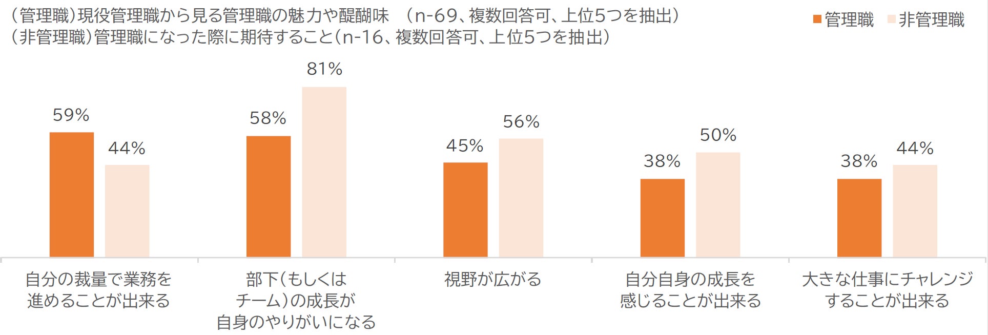 アンケート結果を見ると、管理職・非管理職ともに、「裁量の大きさ」や「部下の成長」を管理職の魅力として考えていることが分かりました。その他、「視野が広がる」「自分自身の成長を感じることができる」「大きな仕事にチャレンジすることができる」ことも管理職の魅力として捉えられており、特に非管理職からは、「部下の成長」が管理職の魅力に映ることが分かりました。(図表)