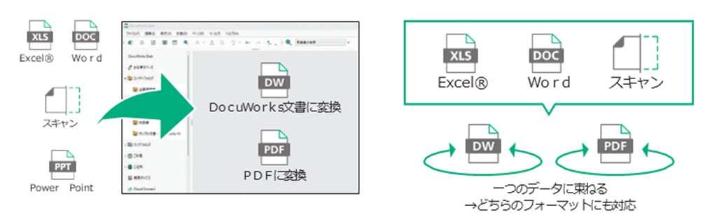 「DocuWorks」は、文書を閲覧するための PC上で再現した電子の机(DocuWorks Desk)と、その机上に並べたDocuWorks文書を紙のように編集・加工するツール(DocuWorks Viewer)で構成された、ドキュメントハンドリング・ソフトウェアです。国内外で980万ライセンスを超える累計販売実績を誇り、日々の仕事に欠かせないソフトウェアとして、幅広い業種・業務で、多くのお客様に利用されています。