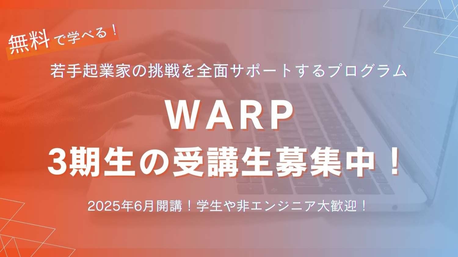株式会社TIMEWELL(本社:神奈川県横浜市、代表取締役:濱本隆太、以下TIMEWELL)は、東京都の多様な主体によるスタートアップ支援展開事業「TOKYO SUTEAM」の協定事業者として、事業支援やアプリ開発、登記や実証実験まで、一部費用も含めてサポートし自ら開発できる、若手テクニカルアントレプレナー育成プログラム「WARP」※(以下WARP)の受講生の募集を開始します。第3期である2025年5月15日から6月開始分の受講生の募集を開始いたします。