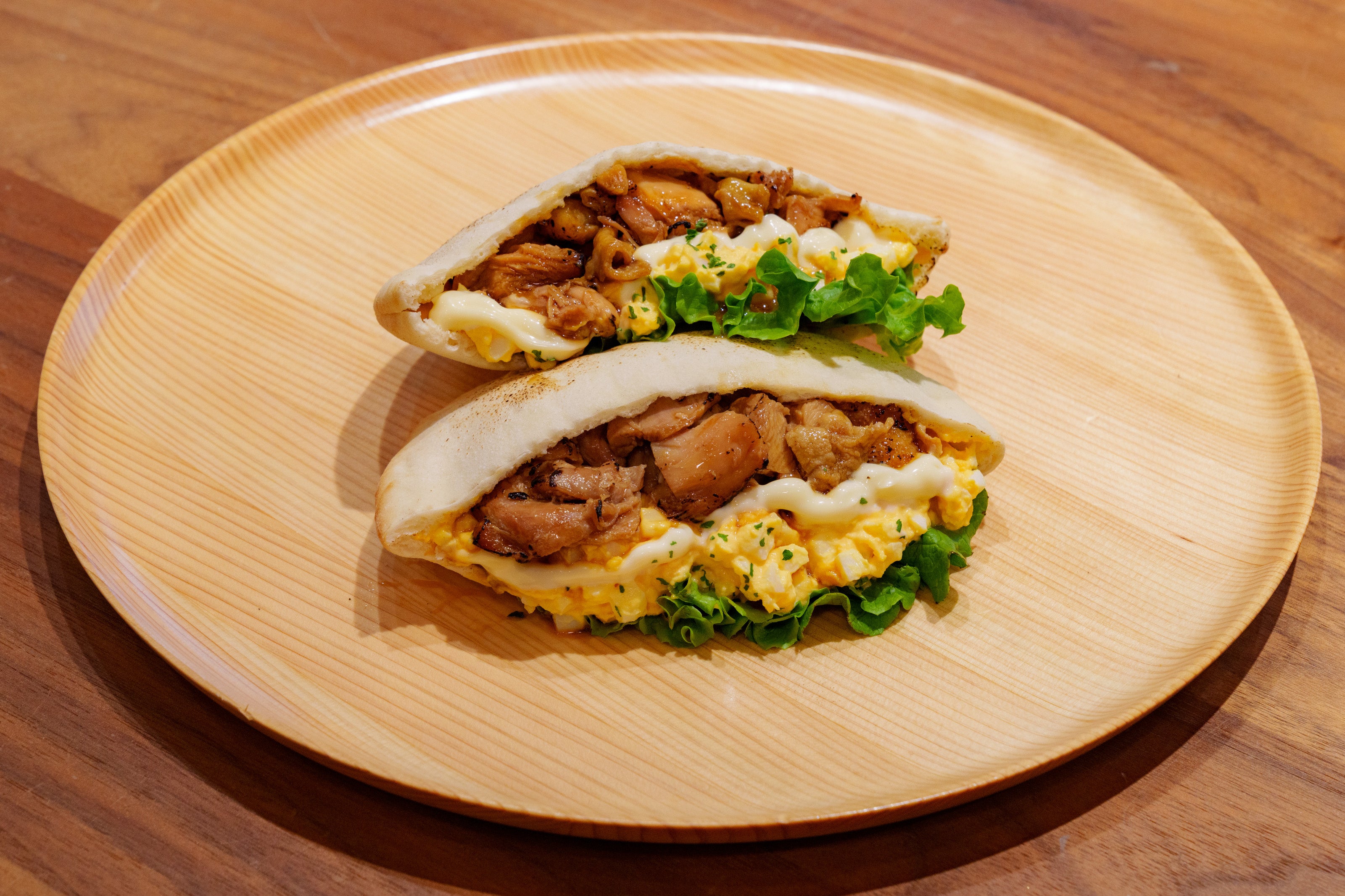 甘辛い照焼きソースが絡んだ鶏もも肉と卵サラダの定番サンドです