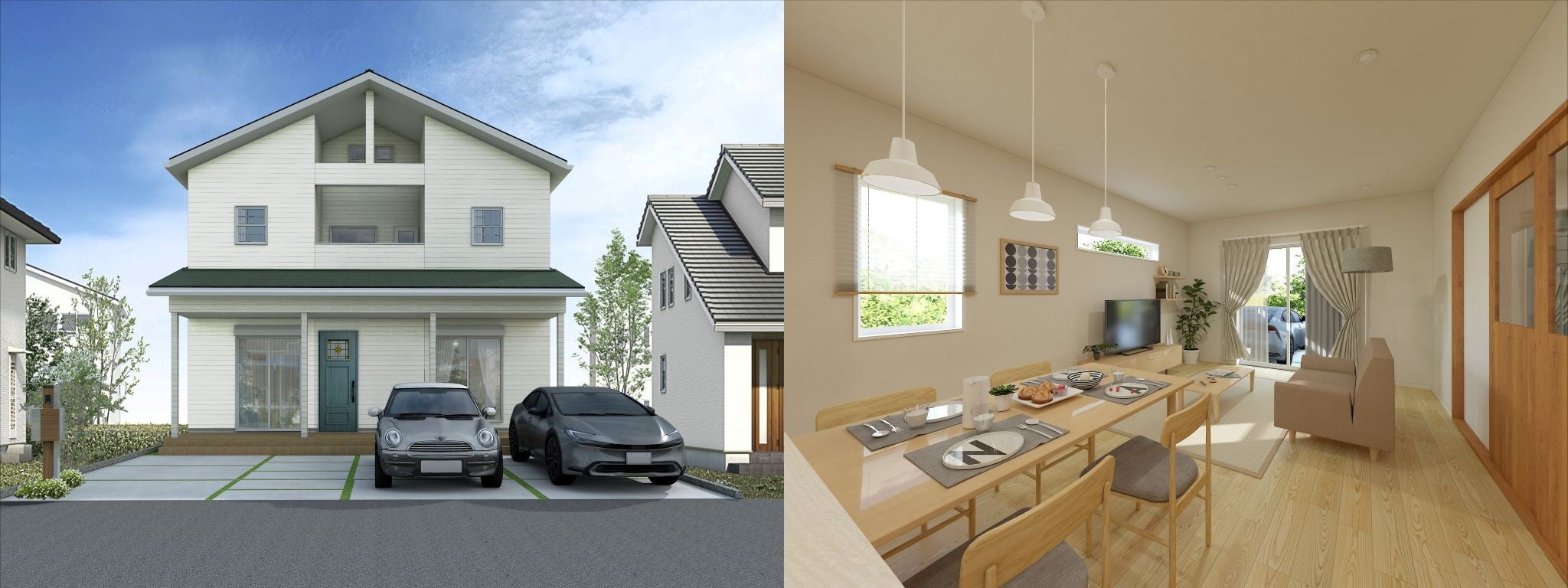 2棟のモデルハウスは、古き良きアメリカをイメージしたスタイルを現代に蘇らせたデザインで、開放感あふれる空間が特徴です。