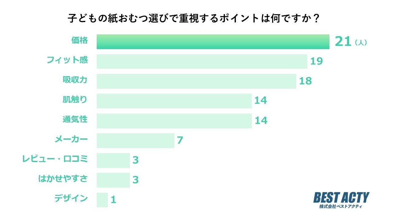 子どもの紙おむつ選びで重視するポイントについて100人にアンケートを行ったところ、「価格」と回答する人が最も多い結果となりました。