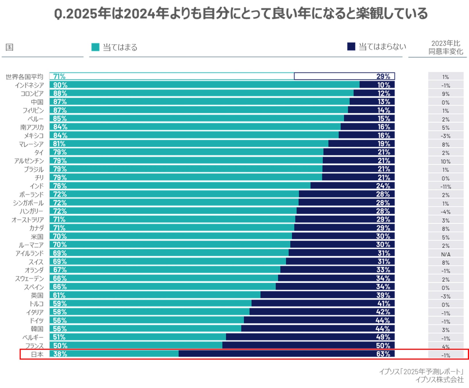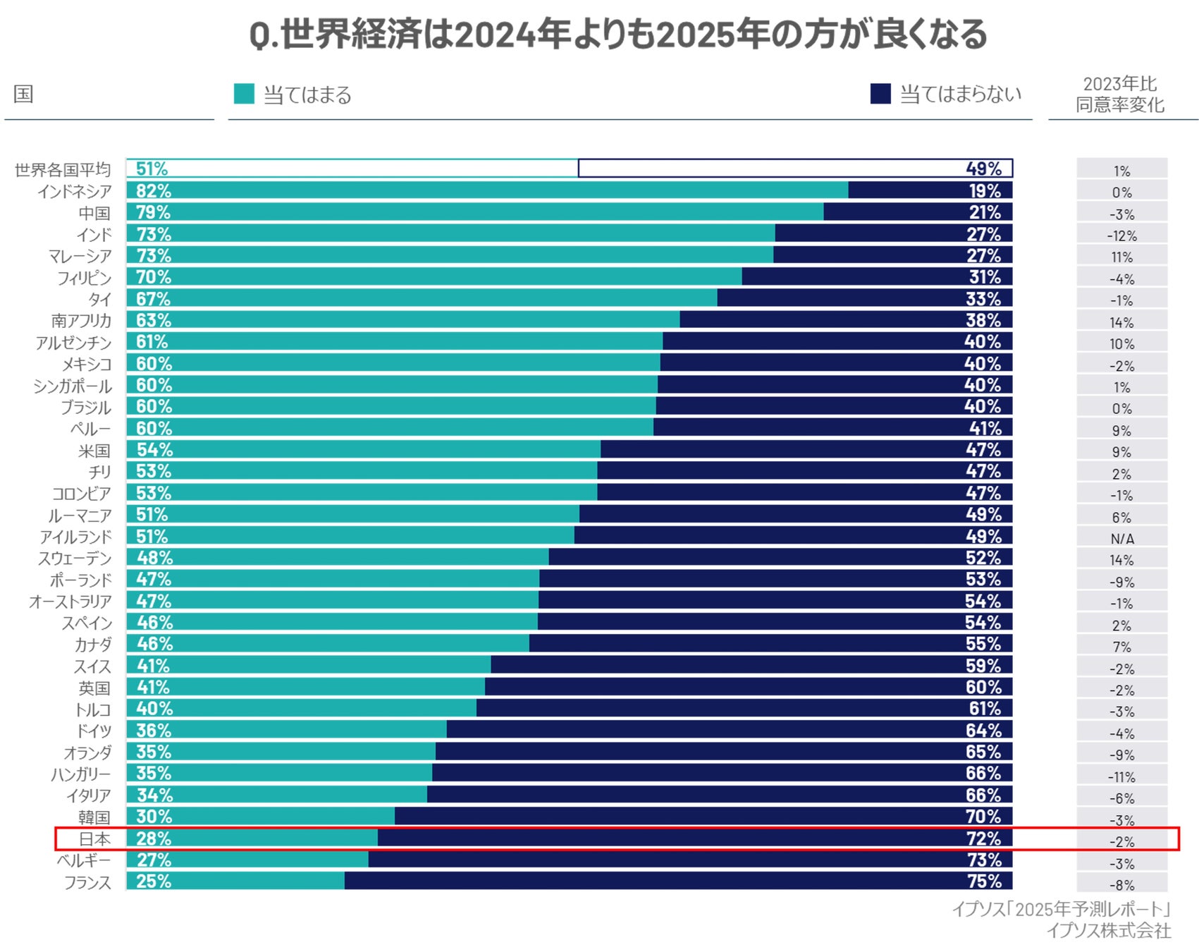 2025年の見通し、日本人は世界で最も悲観的ー「来年は今年よりも良い年になるだろうと楽観している」日本人38%、対象国33カ国中最下位