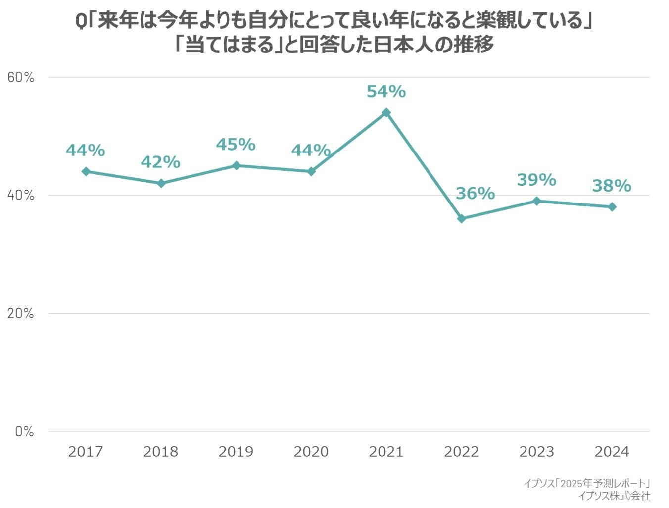 「2025年は2024年よりも自分にとって良い年になるだろうと楽観している」に「当てはまる」と回答した日本人は38%と、33カ国中最下位でした。32位のフランスとは12ポイントの差があり、日本人はグローバル各国と比べても、明るい未来を期待できず、悲観的に考えている人が多いことがわかりました。また2017年からの比較でみても、新年への前向きな期待は、コロナ禍以前のレベルには戻っていません。