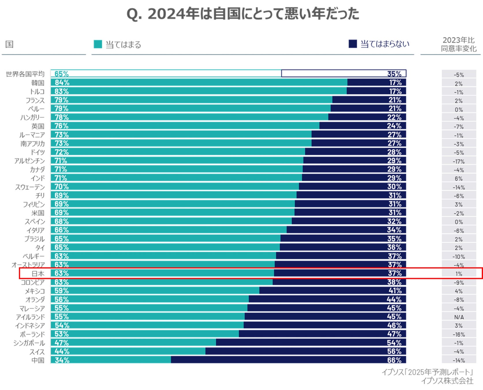 「2024年は自国にとって悪い年だった」という問いに「当てはまる」と回答した日本人は半数以上の63%でした。昨年からはわずかではあるものの増加し、改善の予兆は見られませんでした。