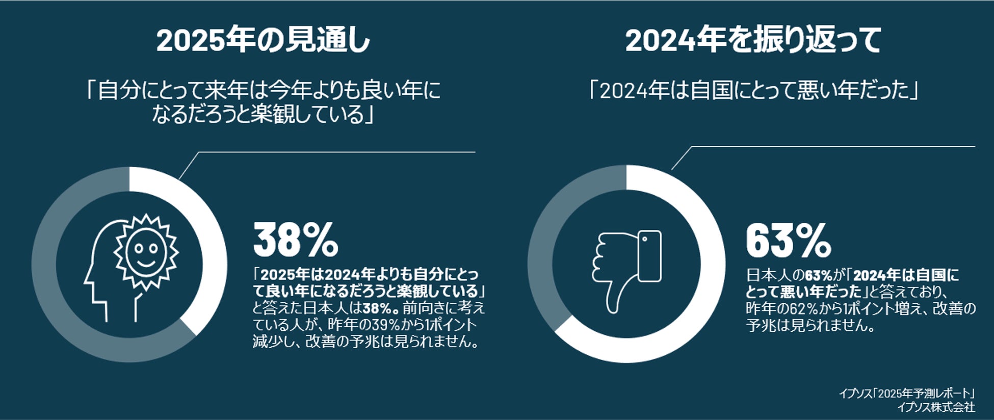 世界最大規模の世論調査会社イプソス株式会社(日本オフィス所在地:東京都港区、代表取締役:内田俊一)は、日本を含む世界33カ国23,721人を対象に2025年の見通しに関する意識調査の結果をまとめたイプソス「2025年予測レポート」を発表しました。調査の結果、「2025年は2024年よりも自分にとって良い年になると楽観している」という問いに対し、「当てはまる」と回答した日本人は38%と、調査対象33カ国中最下位となり、日本人は2025年の見通しについて、世界で最も悲観的に感じていることがわかりました。