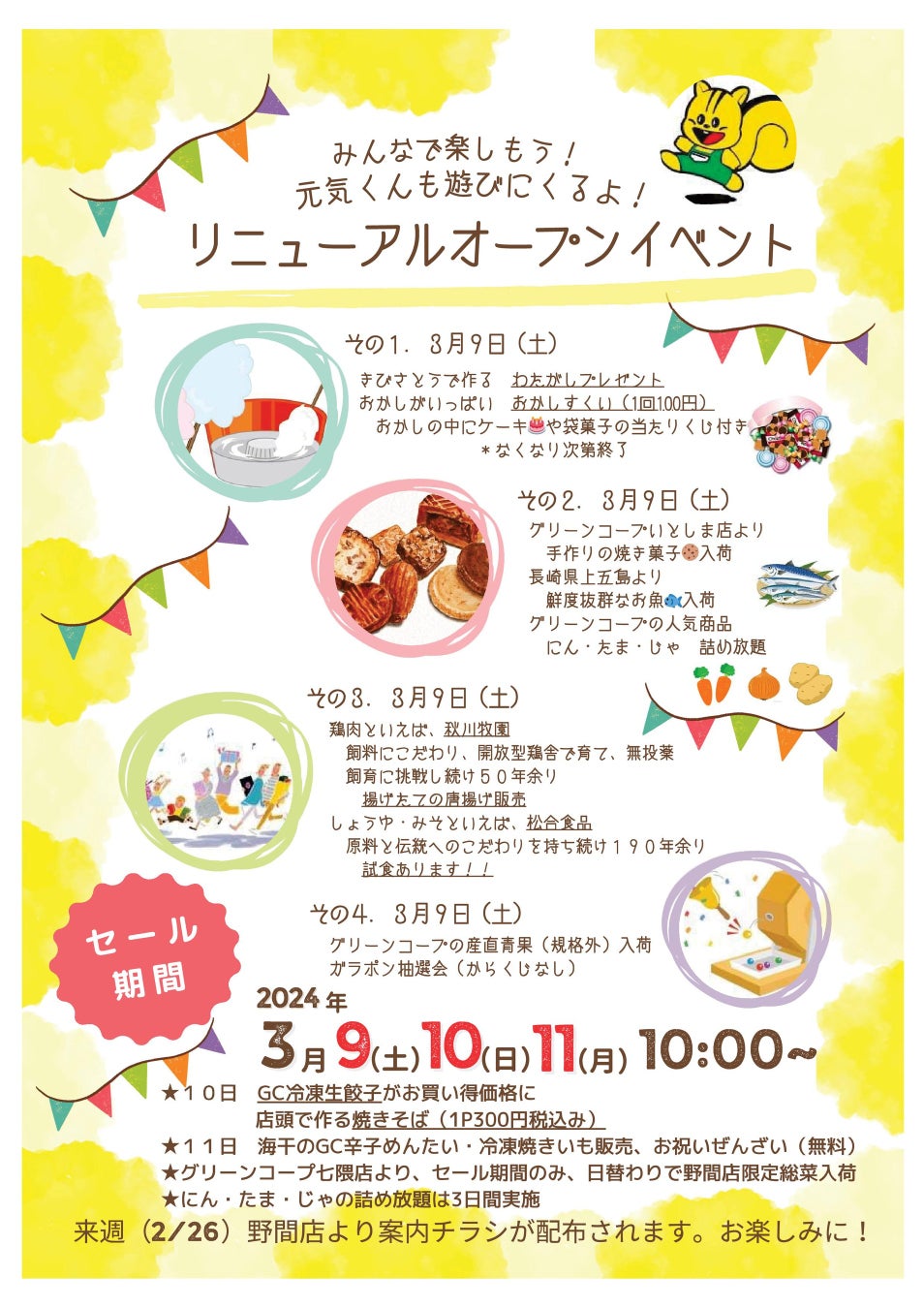 グリーンコープ生協ふくおか野間店のリニューアルオープン・イベントを3月9日(土)10日(日)11日(月)開催
