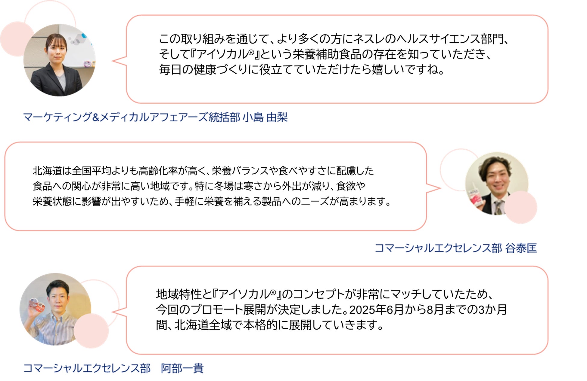目標は、「アイソカル®」という栄養補助食品ブランドをより多くの方に知っていただくこと。通常の食事で十分な栄養を摂ることが難しい方、低栄養、嚥下(えんげ)困難、高齢な方の栄養管理など、様々な食事に関する悩みを抱える方々に向けて、「こんな選択肢もあるんだ」と気づいてもらえるような施策を北海道内で実施します。