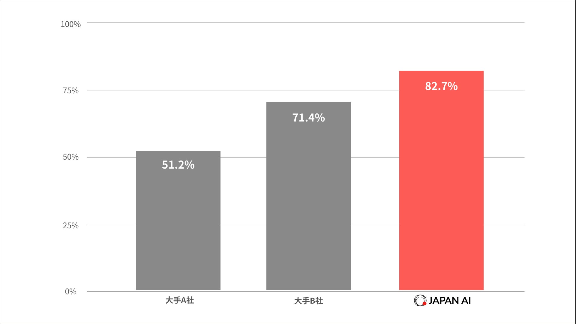 検証結果では、JAPAN AIは82.7%という高い正答率を達成し、A社(51.2%)やB社(71.4%)と比較して優れたパフォーマンスを示しました。この結果は、JAPAN AIの技術が高い検索精度と情報再現性を実現していることを実証しています。