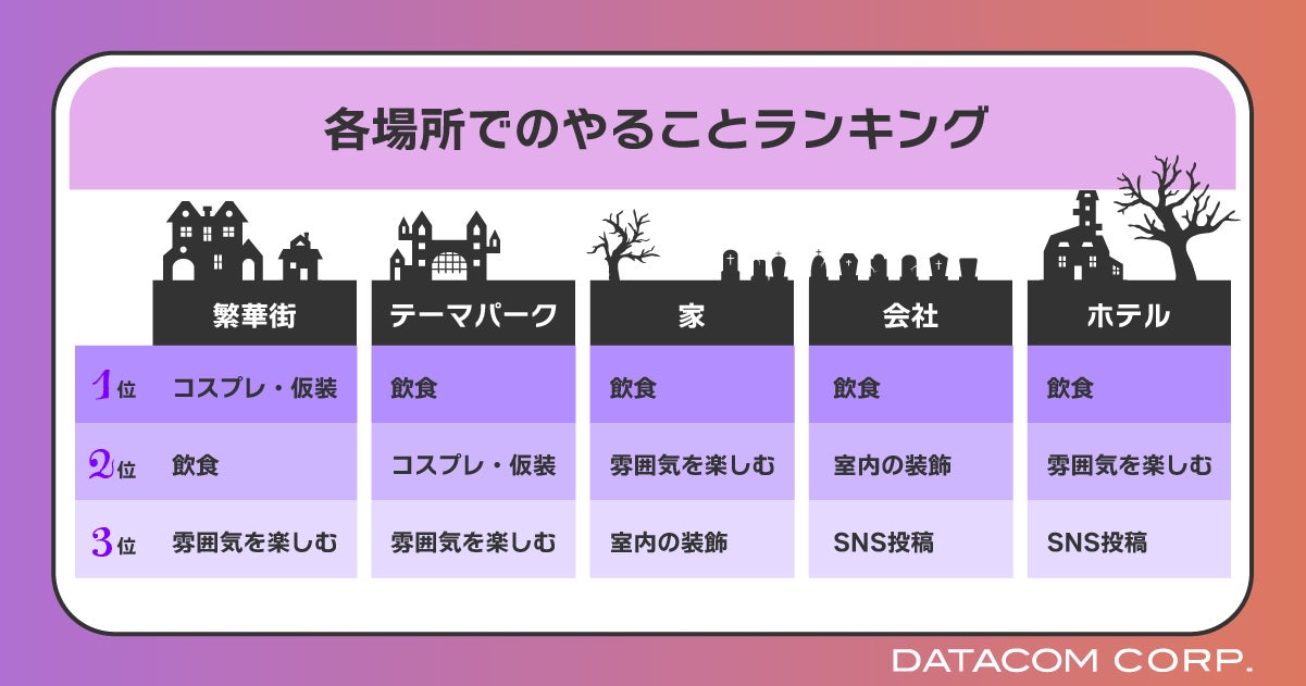 場所ごとに回答のランキングを見てみると、全体を通じて「飲食」と回答した人が多くいました。上述の「街や店の雰囲気を楽しむ」という楽しみ方をする人が多かったこともあり、ハロウィンを感じられる食べ物などが好まれると推察されます。また、繁華街やテーマパークといったイベントとの相性がいい場所では、「コスプレ/仮装」、会社やホテルでは室内の装飾やハロウィンならではの雰囲気をSNSに投稿するという楽しみ方が多いようです。