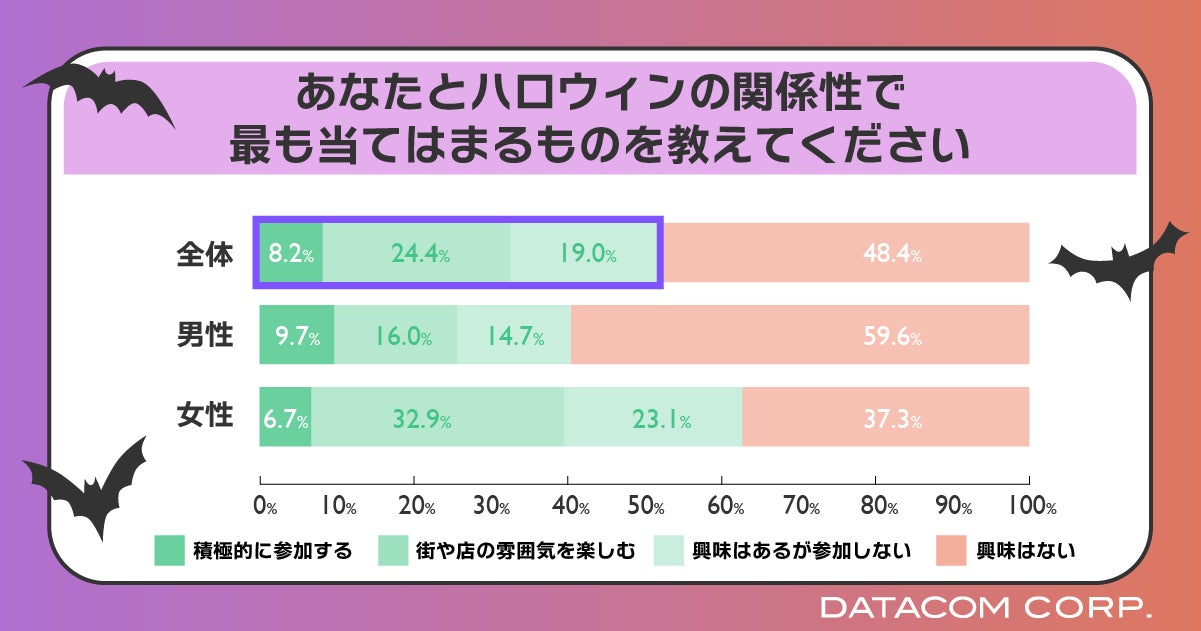 一方で、ハロウィンのイベントへの姿勢としては、全体の半数以上である51.6%がハロウィンに対して何らかの興味関心を示しました。最も多かったのは、「街や店の雰囲気を楽しむ」で24.4%、続いて「興味はあるが参加はしない」19.0%、「積極的に参加する」は8.2%という結果になりました。