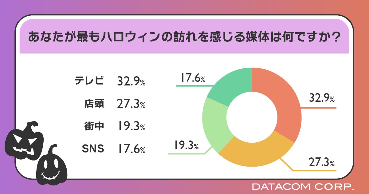 ハロウィンの訪れを最も感じる媒体として「テレビ」と回答した人は32.9%で全体の約3人に1人。次点で「店頭」が27.3%、「街中」が19.3%と続きました。