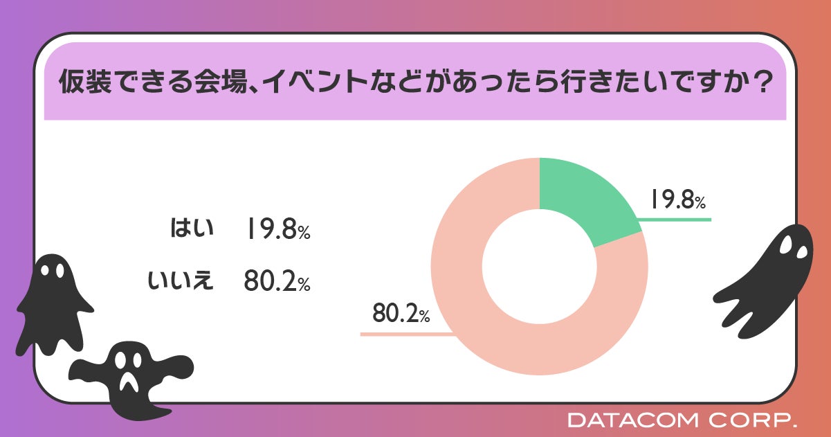 昨年の渋谷封鎖を受けて、他に仮装できる会場やイベントがあったら行くかという質問に対して、「はい」が19.8%、「いいえ」が80.2%という結果になりました。ライトな楽しみ方をする人が多い一方で、ハロウィンの代名詞である仮装に対するニーズは顕在と言えそうです。衣装を作る素材やイベント会場等の需要はまだまだ無くならないのではないでしょうか。