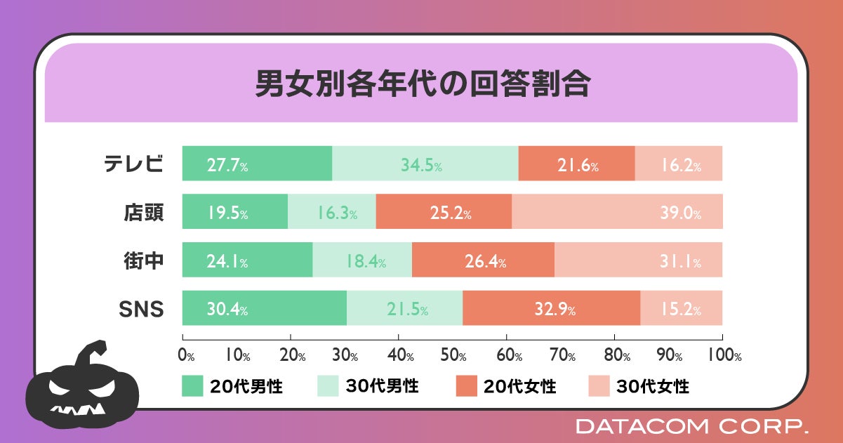 また、性年代別に回答を集計すると、男性は「テレビ」から、女性は「店頭」や「街中」でハロウィンの訪れを感じるという傾向が見られました。情報番組や買い物などそれぞれのライフスタイルの中で季節感を感じやすい媒体が変わってくると考えられます。さらに年代別では男女ともに20代は「SNS」の割合が「テレビ」の割合を上回っており、より若い年代になればなるほど、SNSで情報を目にする機会が増えることが分かりました。