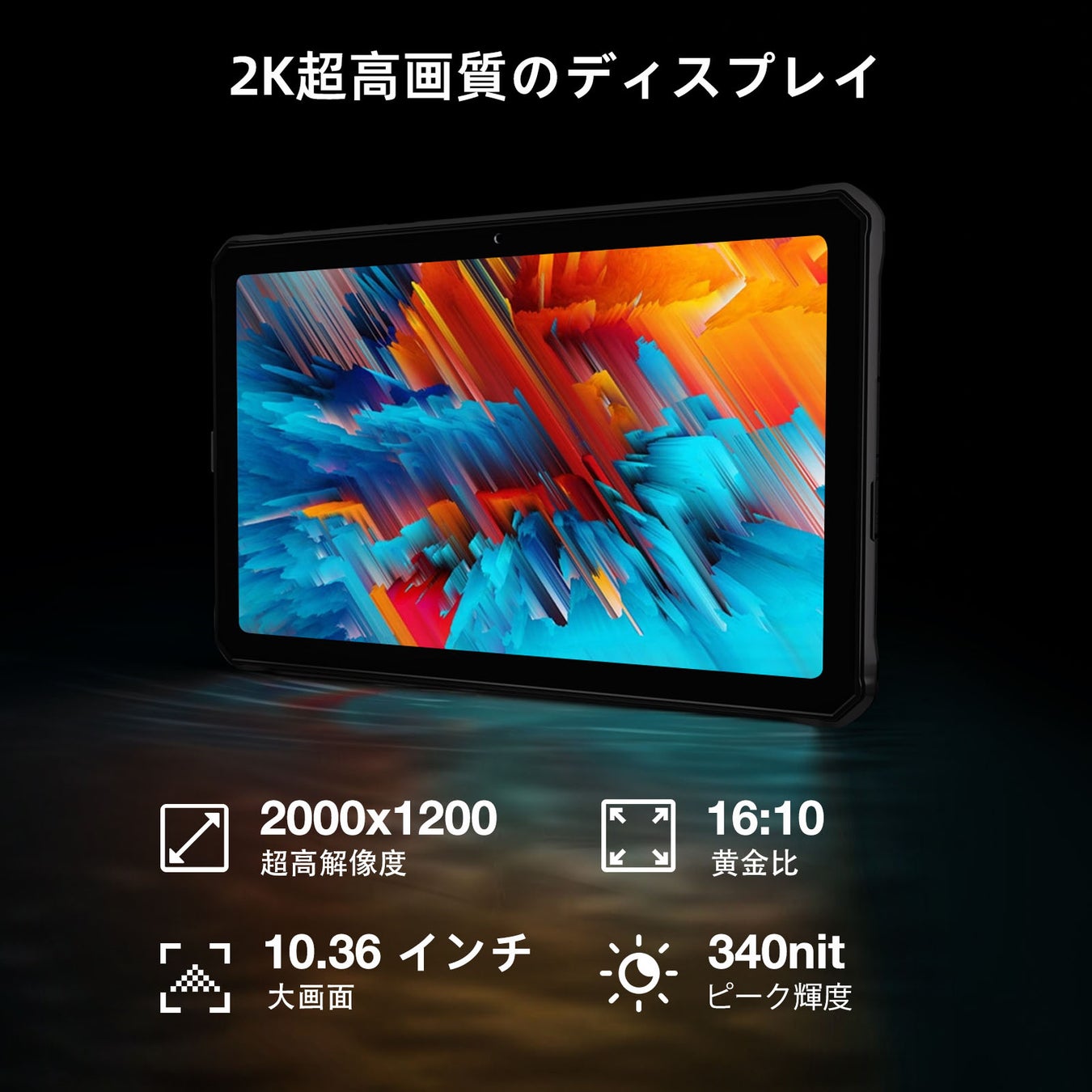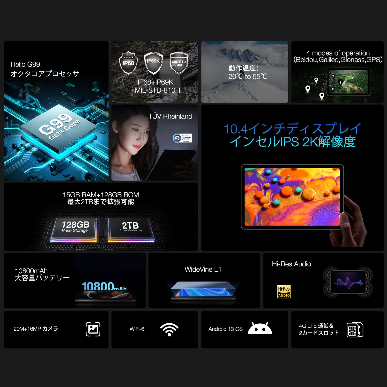 防水防塵耐衝撃タブレットPC、15GB RAM&128GB ROM (2TB拡張可能)、Helio G99 8コアCPU 2.2Ghz、10.4インチ2K FHD IPS 画面、20MP+16MP高精細カメラ、顔認識、10800mAhバッテリー、SIM 4G+WIFI6、18W PD急速充電、GPS