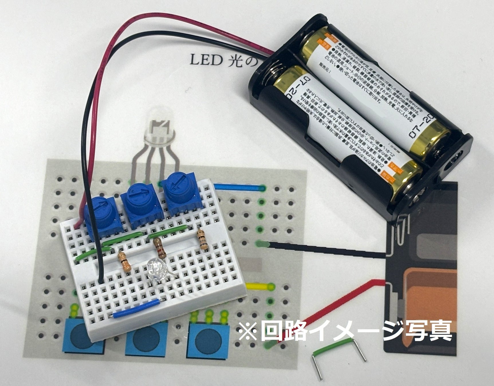 回路製作では、抵抗値を変化することができる可変抵抗を使い「LED」の発光を変えることに挑戦します。