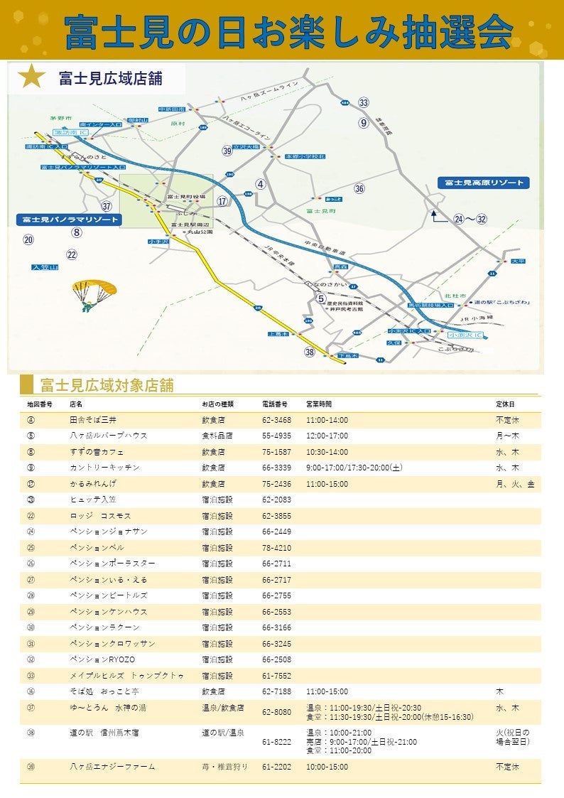 富士山を望めることから名付けられた富士見町が、より地域に愛される町となるように「フジミ」の語呂合わせから2月23日に町内各施設でイベントを開催します。お楽しみ抽選会や図書館にて古本市の開催等、「富士見の日」限定の割引サービスなどたくさんのイベントを計画しています。ぜひお誘いあわせのうえ、皆様のご参加をお待ちしております。