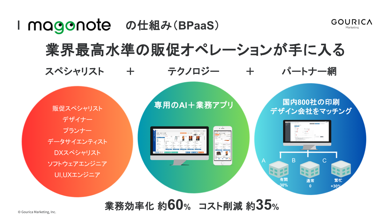 ゴウリカマーケティングは、企業がすぐに必要としている「人材・スペシャリティ」+「テクノロジー」+「サプライヤ網」といった、営業、マーケティング領域の新たな基盤(プラットフォーム)を提供し、継続的な生産性の向上とROIの向上を実現しているBPaaS企業です。