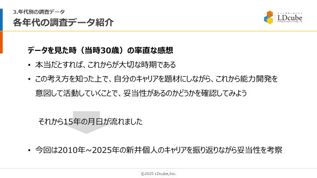 本ウェビナーは、今回ご案内する考え方を知った当社代表の新井(現在45歳)が、その考え方に触れた時(当時30歳)から15年間の歳月をかけ、自らのキャリアを題材に、能力開発に適したタイミングで、能力開発につながる経験を自らどのようにデザインしようとし、それがその後15年間の能力開発とキャリア形成にどのような影響を与えたのかを振り返りながら、実体験を交えて能力開発のポイントを解説するというものです。
