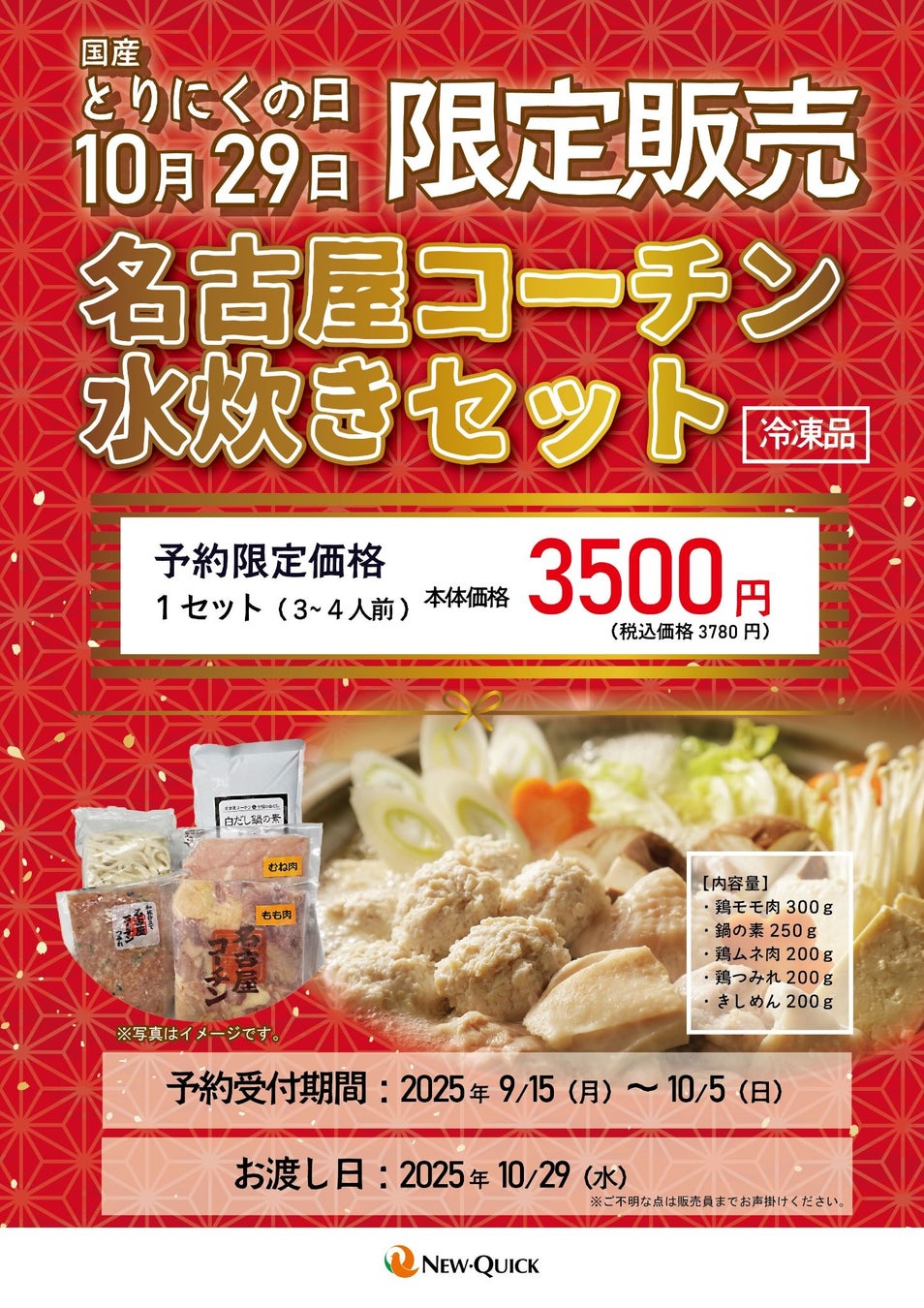 「クイック感謝祭」開催!高品質なお肉をより身近に、よりお得に楽しむ3日間 “国産とり肉の日”には名古屋コーチン水炊きセット登場秋の食卓を応援!