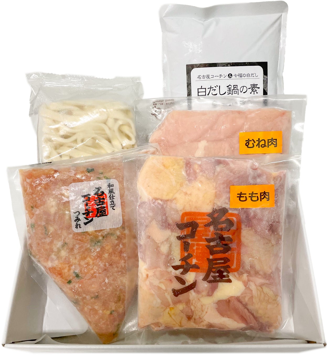 ■商品内容:名古屋コーチンもも肉300g、名古屋コーチンむね肉200g、名古屋コーチンつみれ200g、鍋の素250g、きしめん200g (約3〜4人前)