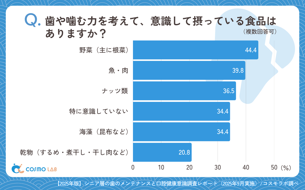 「野菜(主に根菜)」(44.4%)が最多で、「魚・肉」(39.8%)、「ナッツ類」(36.5%)、「海藻(昆布など)」(34.4%)も高い水準でした。しかし「特に意識していない」(34.4%)も同率で存在し、意識の差が大きいことが分かります。