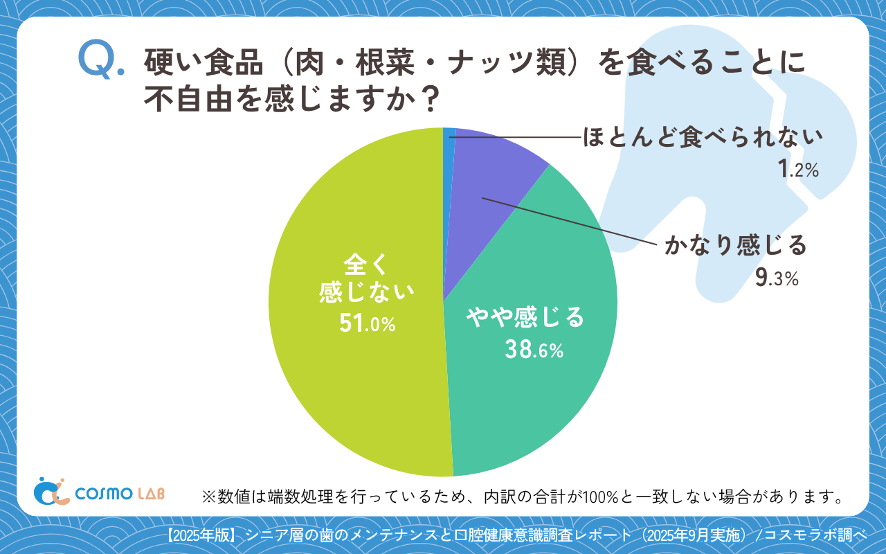 「全く感じない」(51.0%)が最多で、半数以上は咀嚼力に自信を持っています。しかし、「やや感じる」(38.6%)や、「かなり感じる」(9.3%)を合わせると約半数は不自由を抱えており、加齢に伴う咀嚼機能低下が進んでいることが示唆されます。
