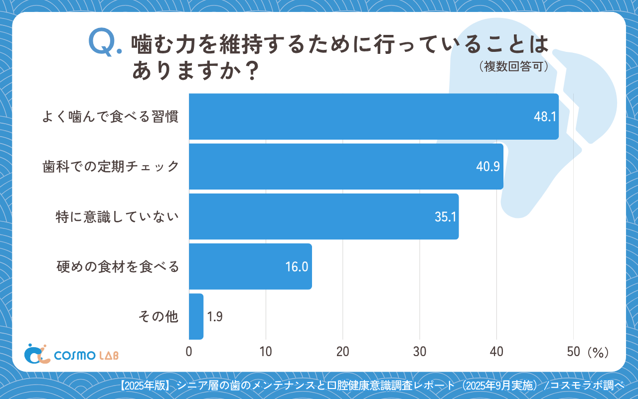「よく噛んで食べる習慣」(48.1%)が最多で、「歯科での定期チェック」(40.9%)も比較的高く支持されています。一方で「特に意識していない」(35.1%)も多く、意識層と無意識層の差が鮮明です。
