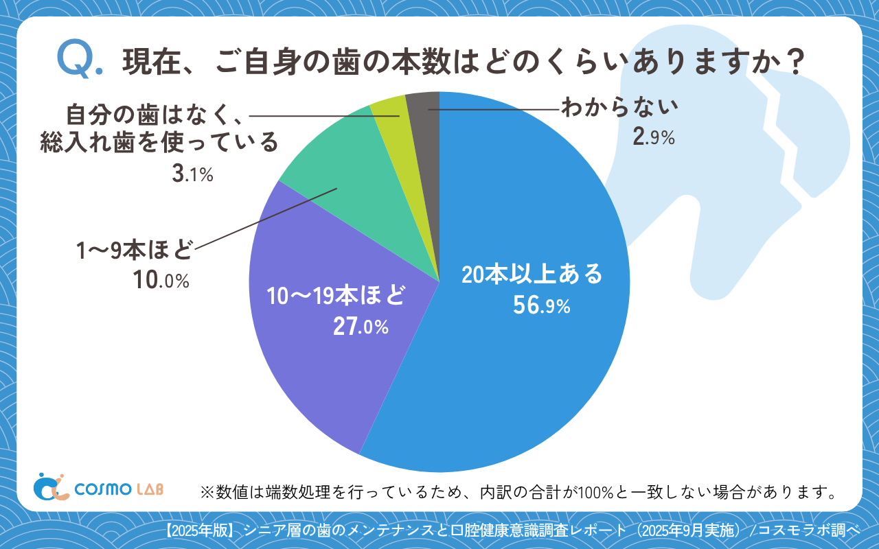 「20本以上ある」(56.9%)が最多で、シニア層の半数以上は一定の咀嚼機能を保持しています。しかし、「10〜19本ほど」(27.0%)や「1〜9本ほど」(10.0%)を合わせると約4割は一定数の歯を失っており、加齢に伴う影響が顕著です。