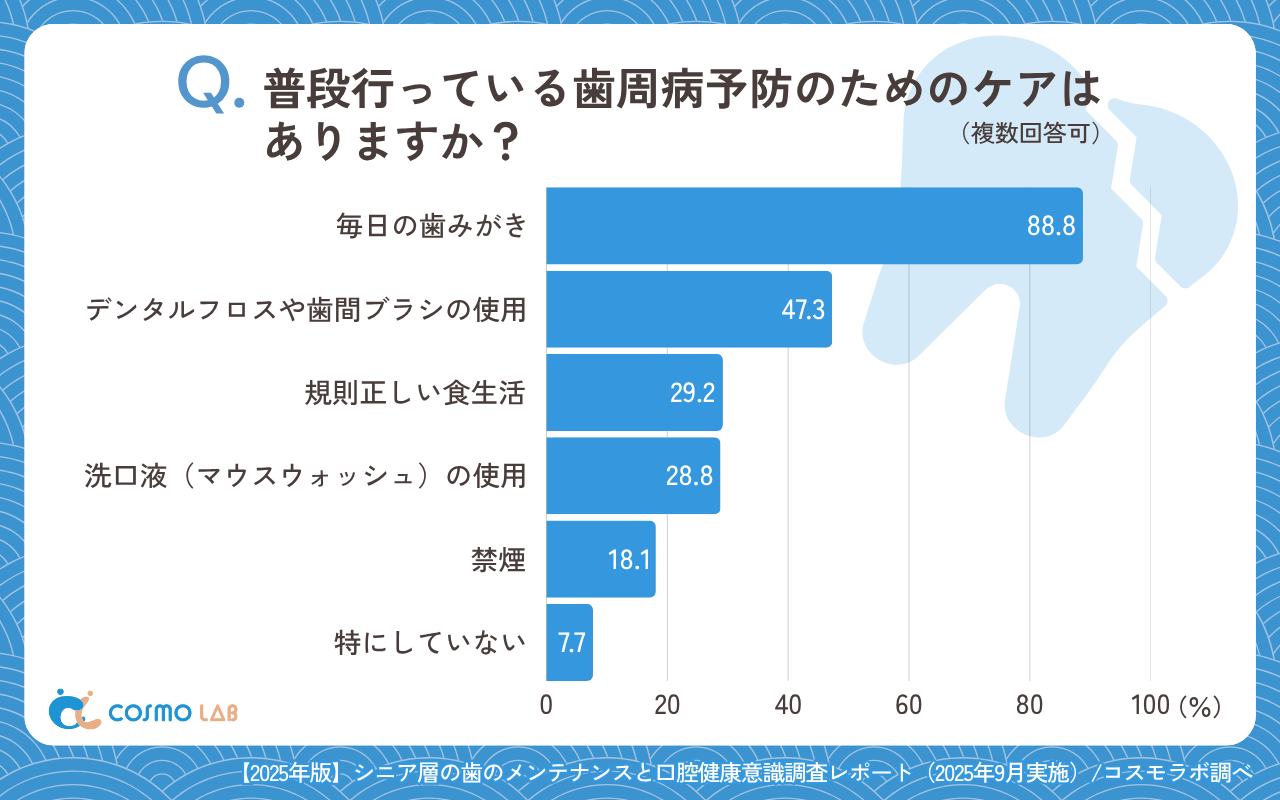 「毎日の歯みがき」(88.8%)が圧倒的に多く、基本的ケアは広く浸透しています。しかし「デンタルフロスや歯間ブラシの使用」(47.3%)、「洗口液(マウスウォッシュ)の使用」(28.8%)といった補助的ケアは半数未満にとどまり、十分に普及していません。