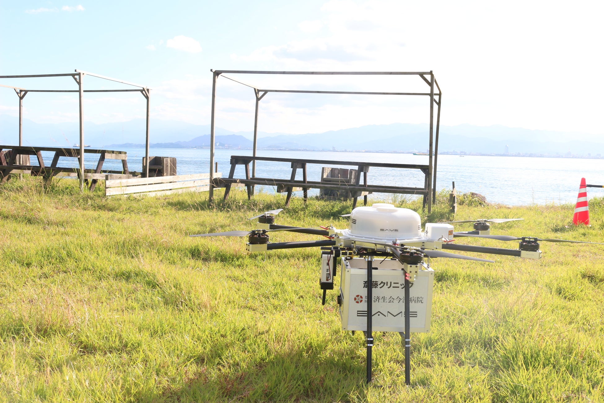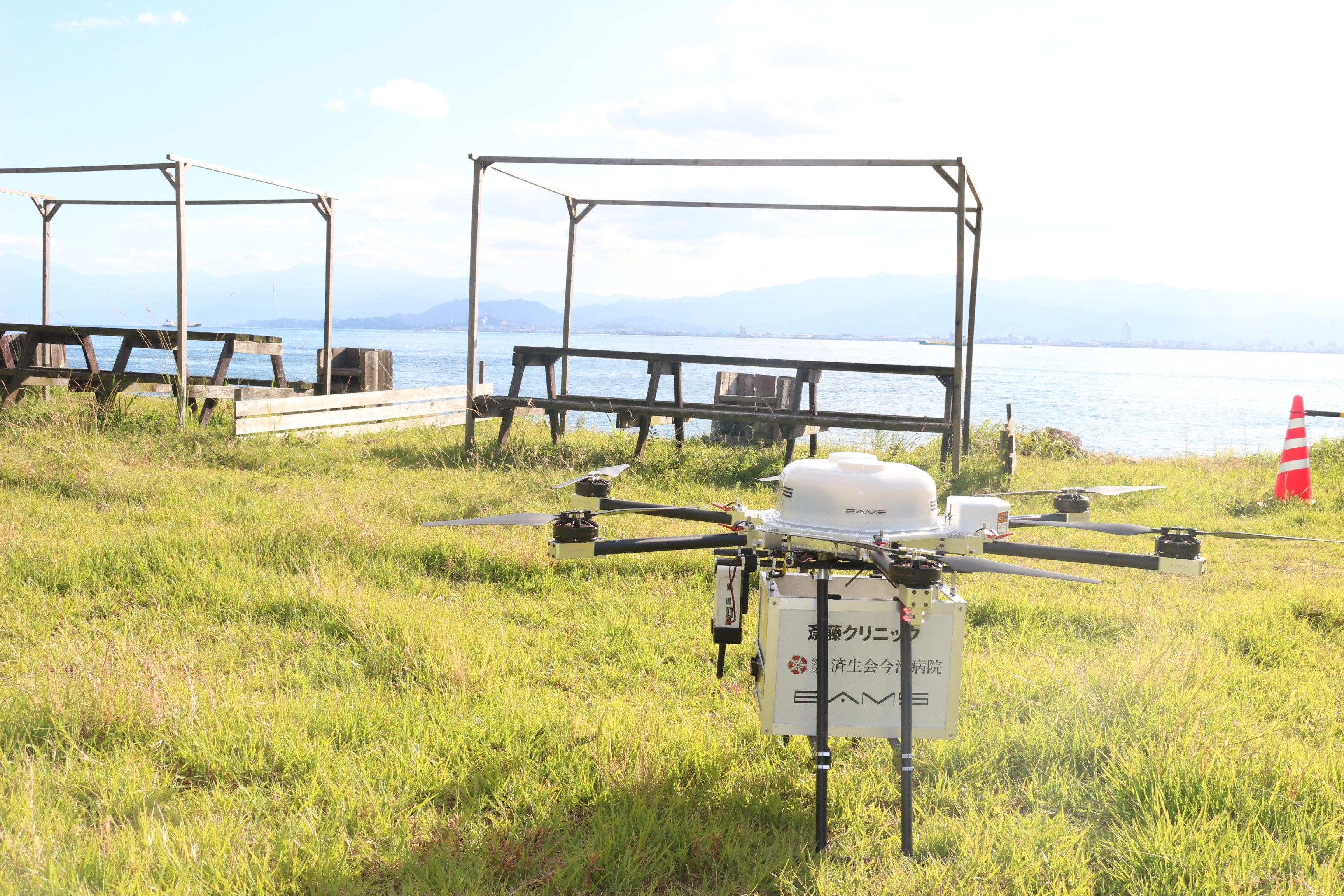 今治市(市長:徳永繁樹)が国家戦略特区の一環で設置している「近未来技術実証ワンストップセンター」による支援のもと、斎藤クリニック(今治市、院長:齋藤早智子)とイームズロボティクス株式会社(本社:福島県南相馬市、代表取締役:曽谷英司)と連携し、南海トラフ地震を想定したドローンによる医療品輸送の実証実験を実施しました。離陸地点は今治市内の砂場スポーツ公園(今治市砂場町1-662)、着陸地点はしまなみ海道沿線の大島・海宿千年松キャンプ場(今治市吉海町名駒25)。来島海峡上空の片道約4kmを約10分で結び、災害時における島しょ部への医療支援の即応性を検証しました。