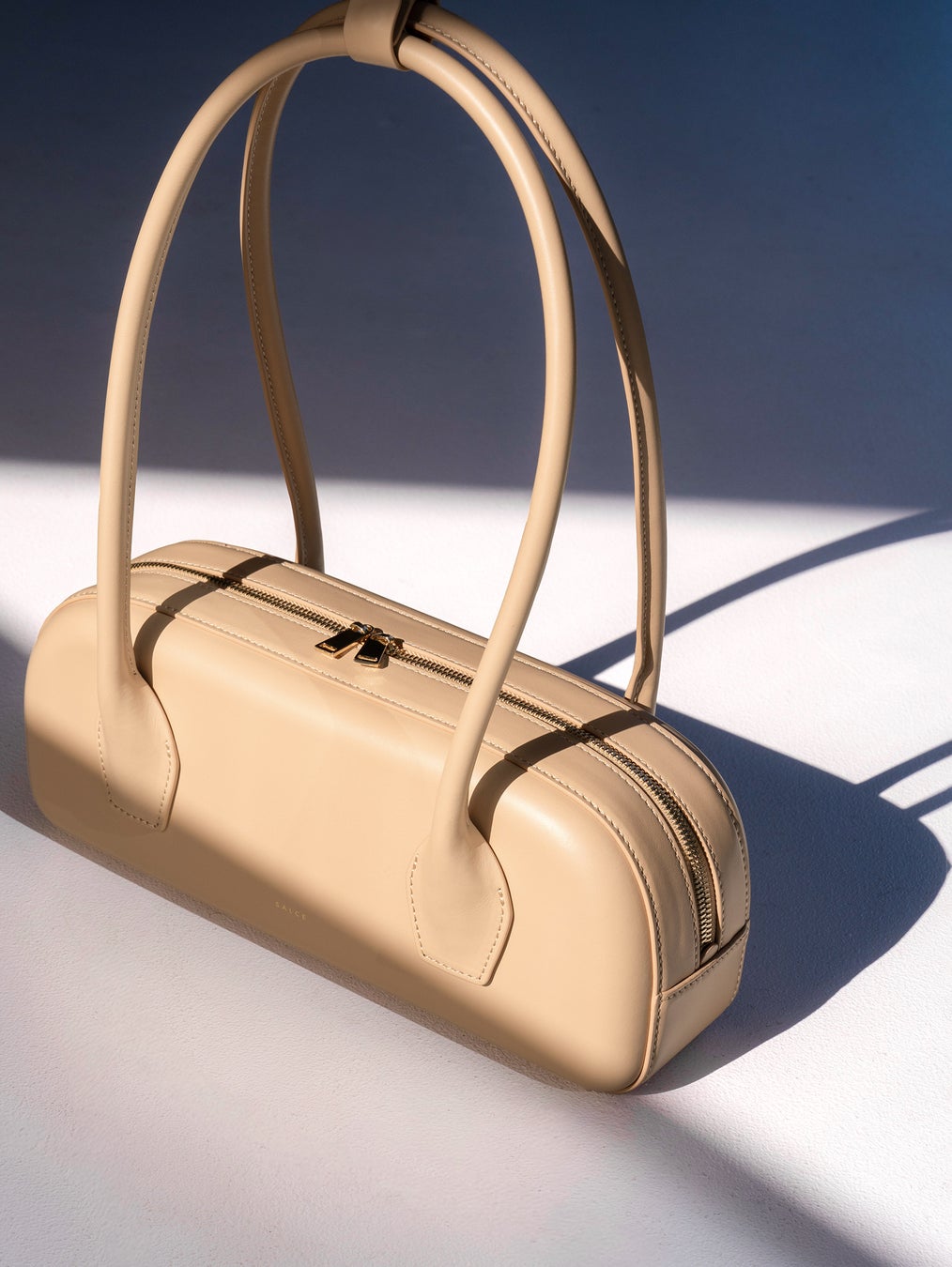 フルグレインカーフレザーを贅沢に使用し、ハンドバッグやショルダーバッグとして楽しめる2WAY仕様。横長のバゲットシルエットが印象的なミニマルな佇まいは、著名な家具ブランドから着想を得てデザインしており、プロダクトの美学を、女性が身にまとう装いへと昇華させました。