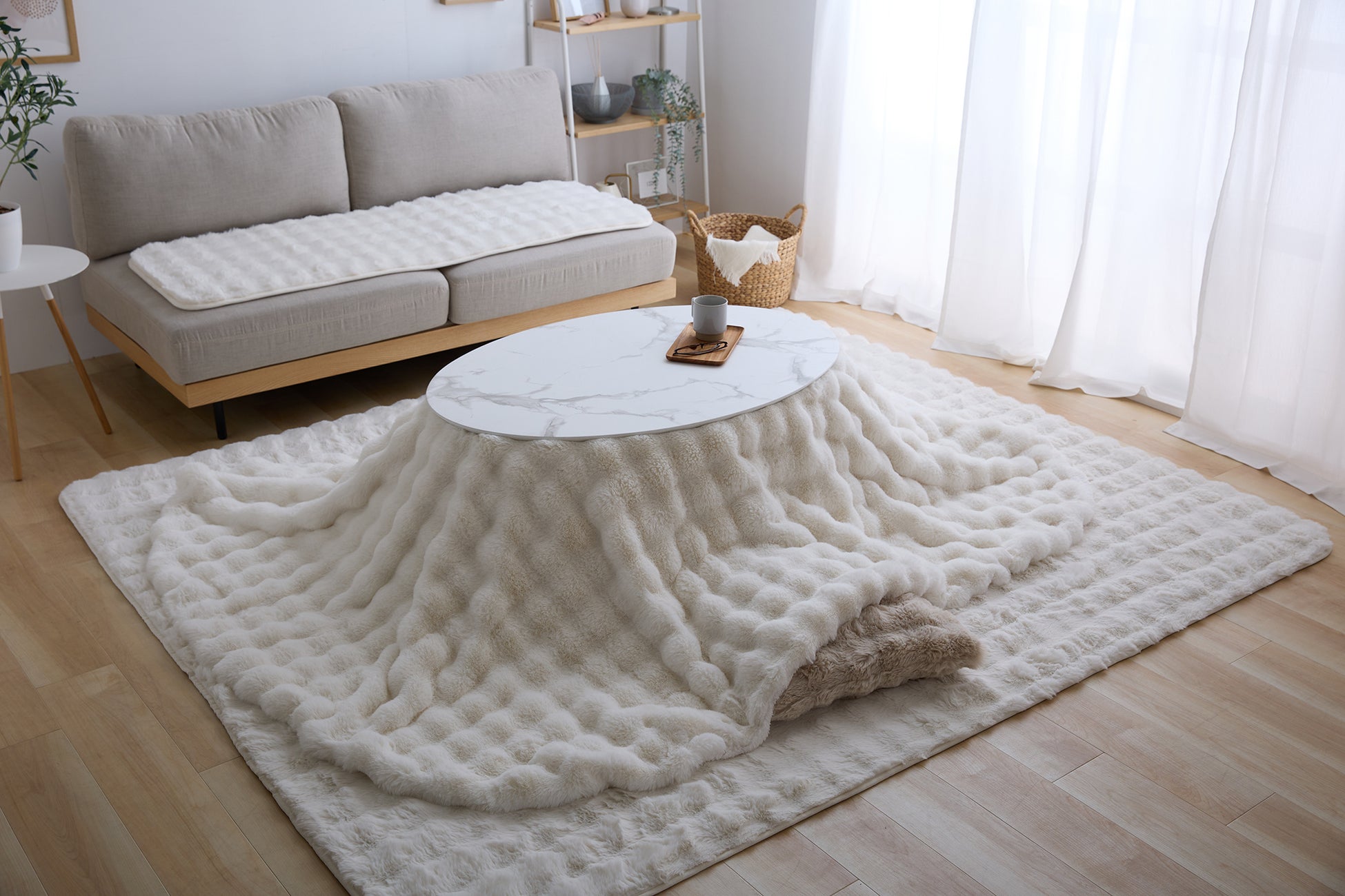 うさぎのようにやさしい手ざわり。『mocone(モコネ)』は、ふれるたびに心がほどけるような、ふわふわ・もこもこ質感のラビットファー調シリーズです。おうち時間をやさしく包み込むあたたかアイテムを展開し、「毛布」「こたつ布団」「ラグ」「ソファーパッド」など、トータルコーディネートができるラインナップをご用意しました。全アイテムとも、インテリアになじむ「ホワイト」と「ミルクティー」の2色展開で統一。冬のお部屋を、やさしく上品に彩ります。