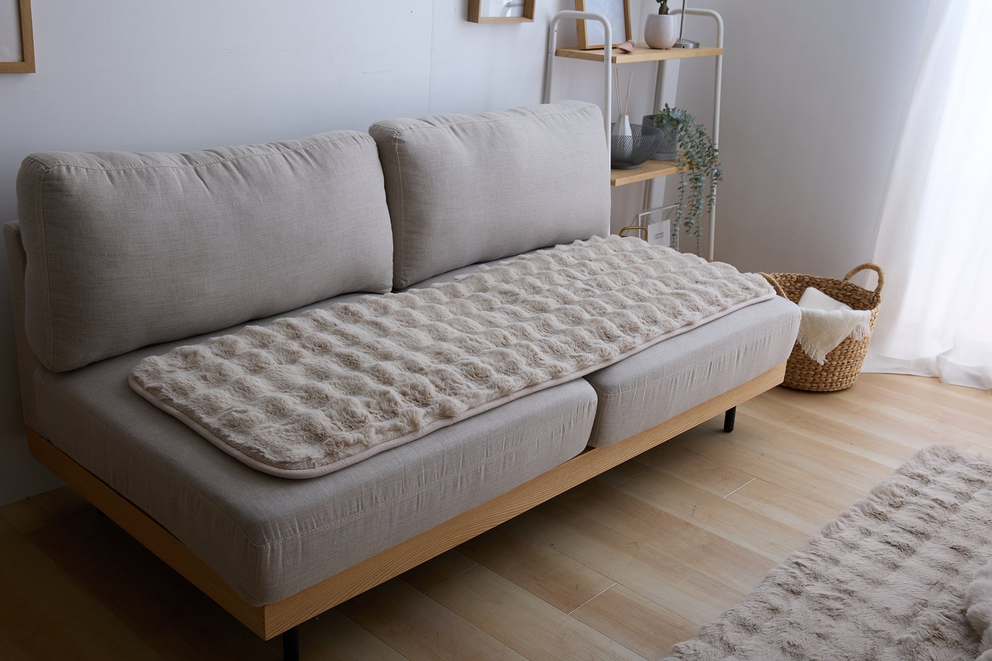 もこもこした質感が座面をやさしく包み、座るたびにリラックス。2P・3Pソファーに対応する2サイズ(50×150cm/60×180cm)展開で、床に敷いてマットとしても活躍します。