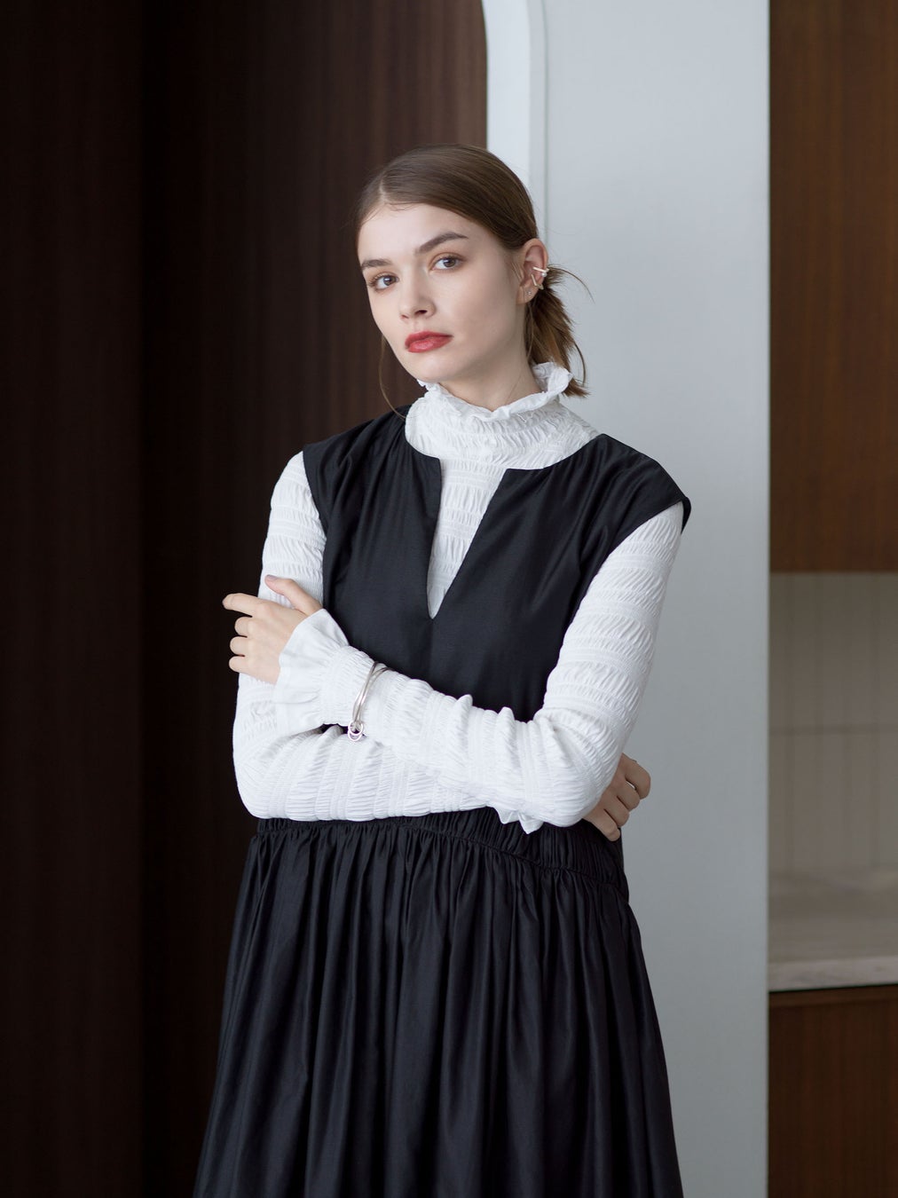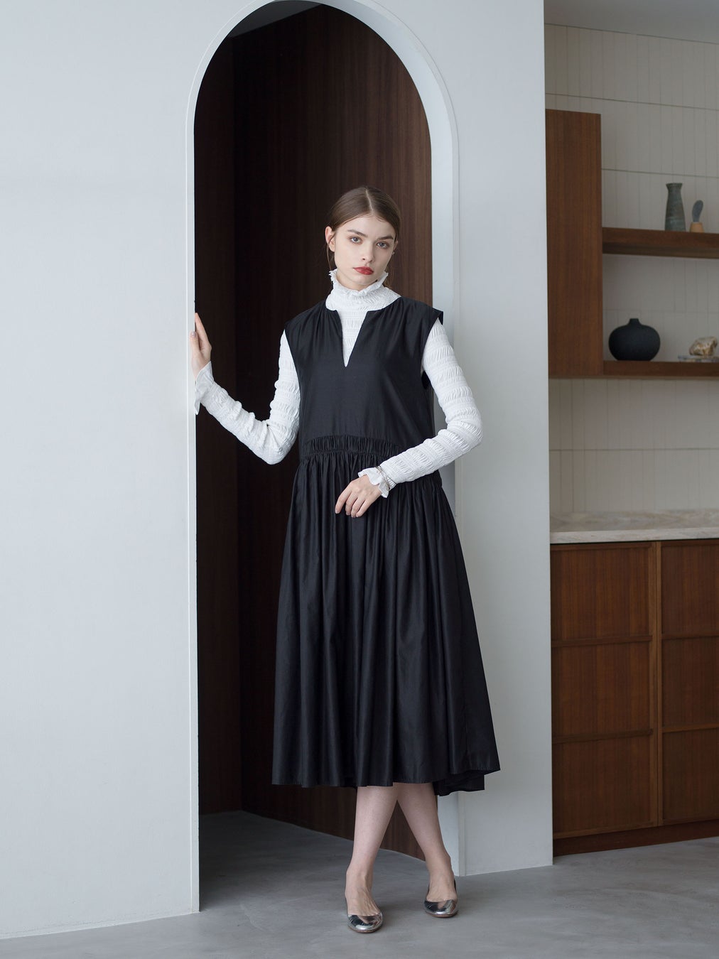 GLARUS(グラールス)は、上質なコットンシルク素材を使用したエレガントなロングドレス。首元をすっきりとみせるスリットネック、ハイウエストに施されたギャザーのディテールがポイントです。裾は前後差のあるフィッシュテールのデザインで優美なシルエットを演出します。ドレスの下にハイネックトップスKANTOR(カンター)をあわせたレイヤードスタイルもおすすめです。
