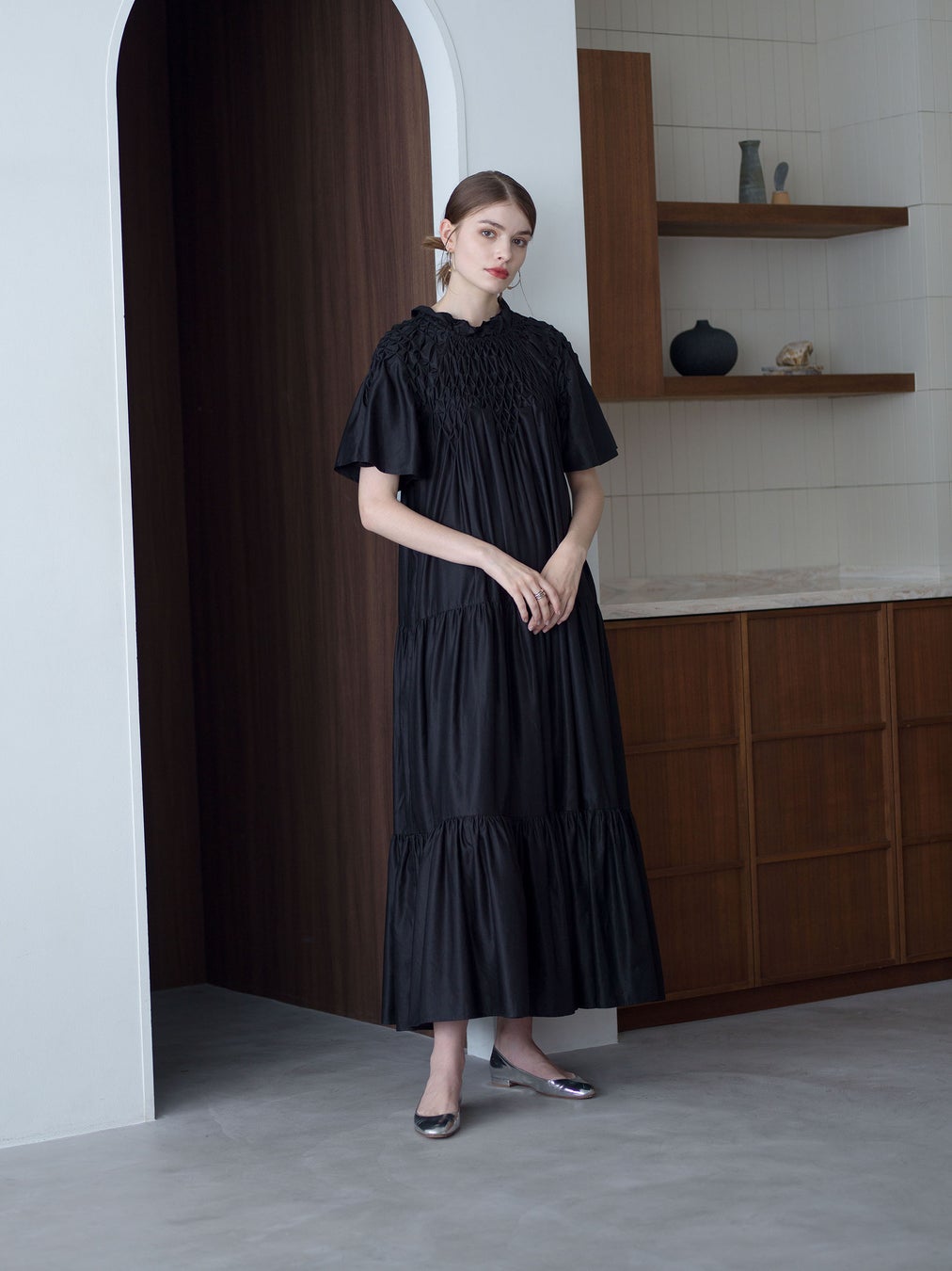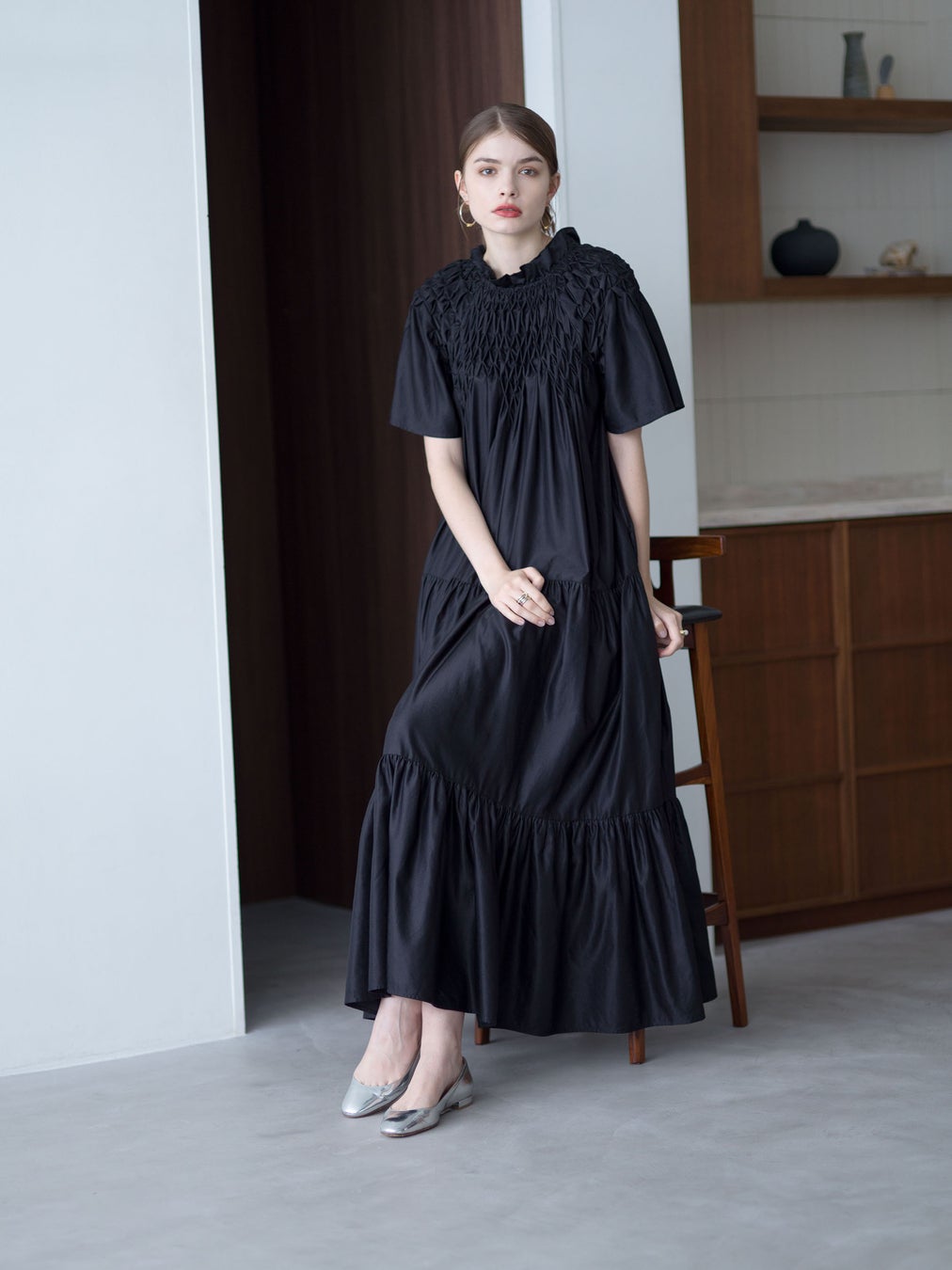 サテン仕上げのコットンシルク素材で作られたマキシ丈ドレスBEJART(ベジャート)。ヨークと肩まわりに施した星型のハンドスモッキング刺繍がポイント。首元のフリルとティアードスカートがMerletteらしさを感じられるデザインです。エレガントなシルエットとクラフツマンシップの光るディテールが、まさにイブニングドレスに最適な逸品です。