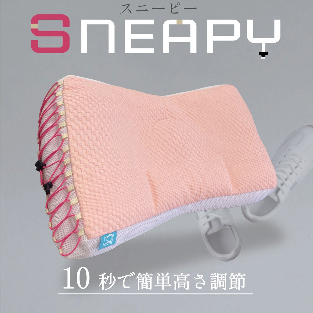 スニーカーをイメージして作られたスニーピーは横マチ部のドローコードを引っ張る事で簡単に高さ調節が出来る高機能まくらです。