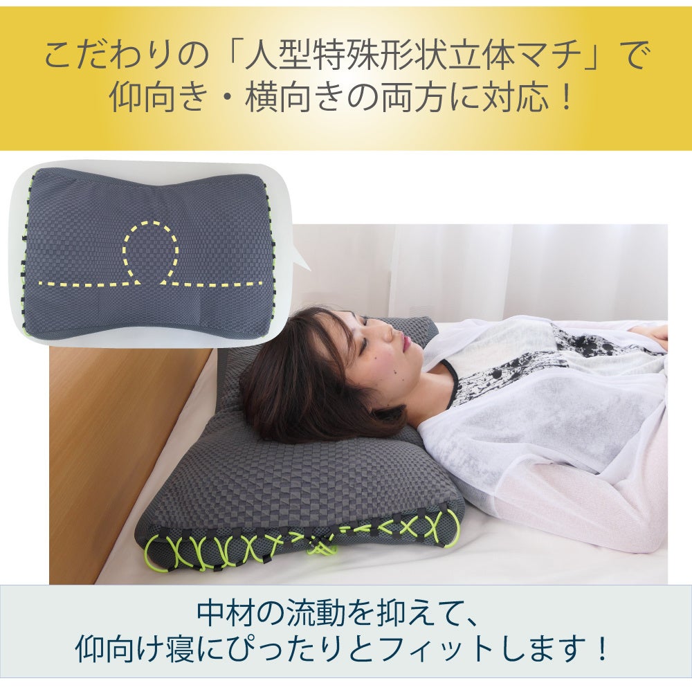 また、人型特殊形状立体マチや横寝をした際にも詰めものが逃げ難い立体マチなども採用されているため、それぞれの寝姿勢で最適な形状を維持出来る仕様のまくらとなっています。