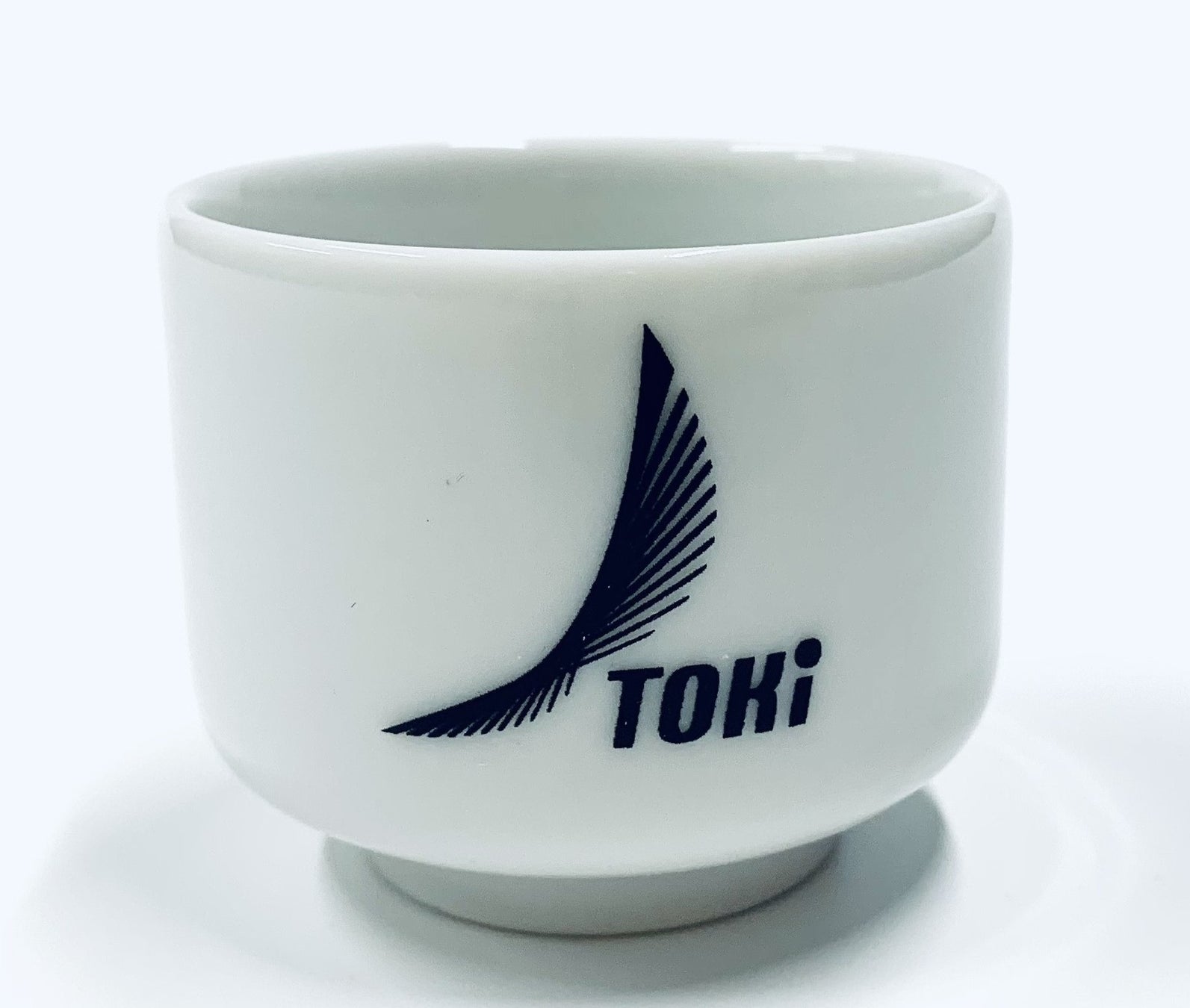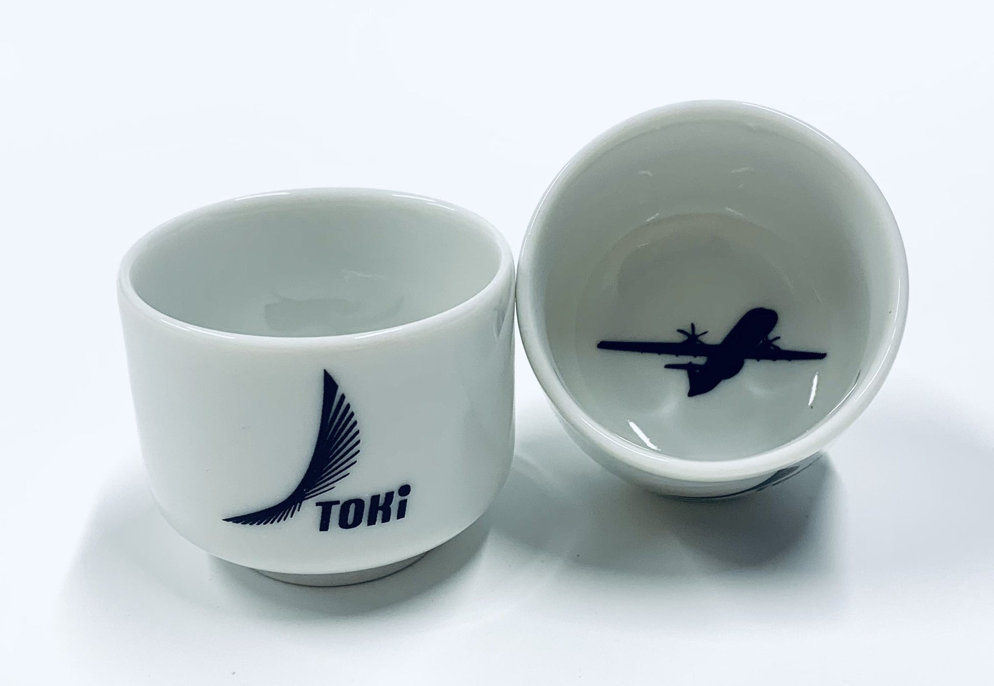 白を基調とした上品なボディに、側面にはトキエアのウィングロゴを配置。さらに、お猪口の内側底面には小さな飛行機のシルエットをデザインし、飲み干す瞬間に“空を感じる”演出を施しています。