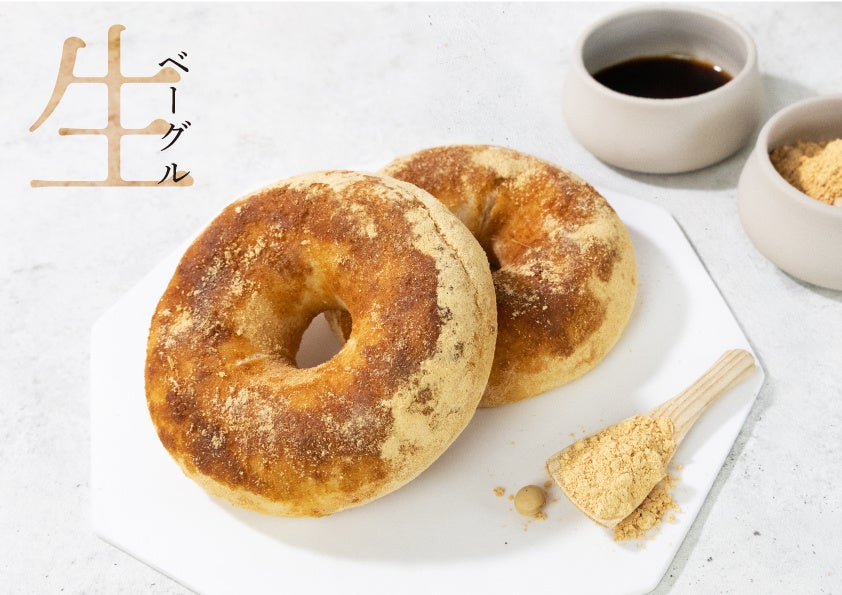 きなこと黒蜜をトッピングした、まるでお餅のような食感がくせになる素朴な味わいの生ベーグルです。