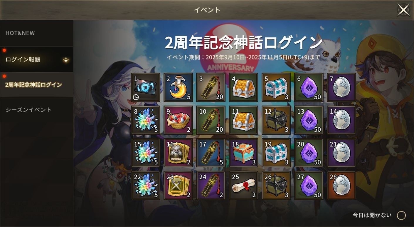 本アップデートより、期間限定で「グローバル2周年記念特別商品」を販売いたします。通常では入手が困難な神話等級アイテムの獲得を目指せるステップアップ商品や、毎日730ゴールドで購入できる「[グローバル2周年]グローバル2周年サプライズ箱プレゼント」が登場。サプライズ箱プレゼントには召喚アイテムや大量のゴールドが同梱されており、冒険をより強力にサポートいたします。