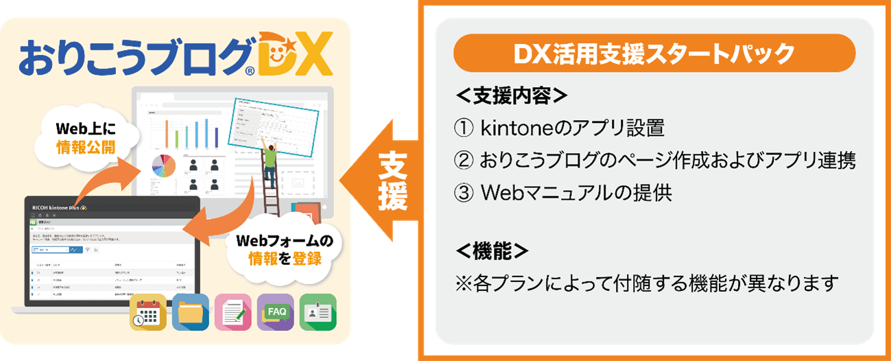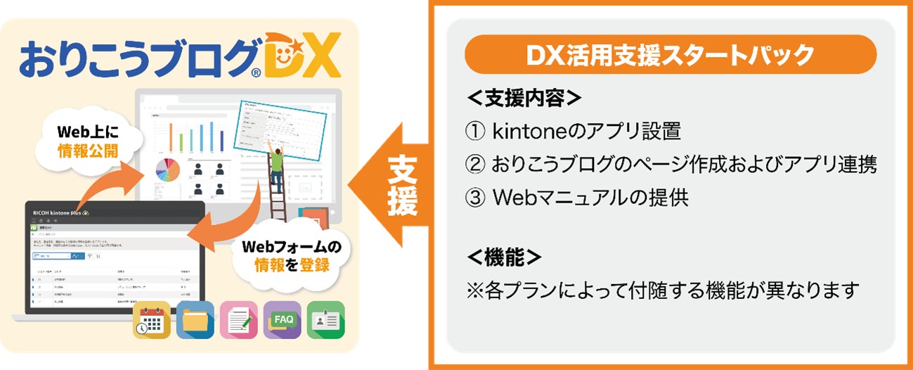「DX活用支援スタートパック」は、業務改善プラットフォーム『kintone』とCMS『おりこうブログDX』の作成・連携を、専門スタッフが一括で支援するサポートパッケージです。 kintoneの活用の幅を広げたい企業様に向けて、導入から運用までのハードルを下げスムーズなDX推進をサポートします。
