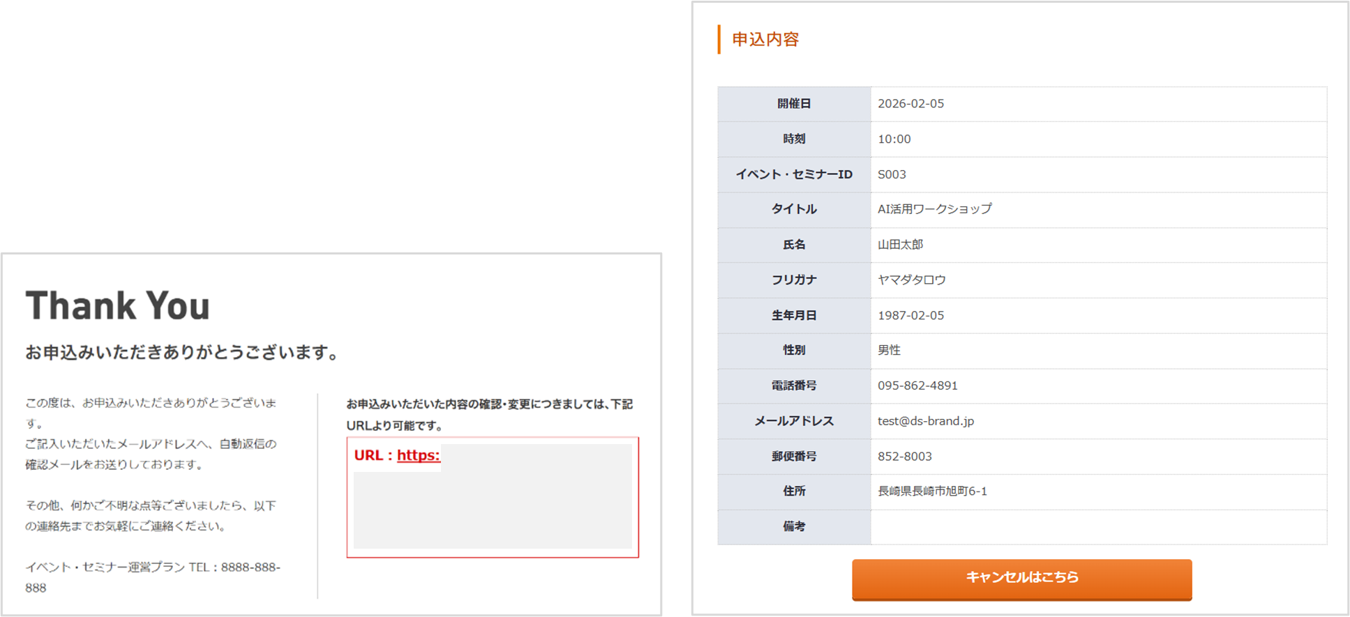 申し込まれた内容は、管理者と申込者の双方へ自動返信メールとして通知が届きます。