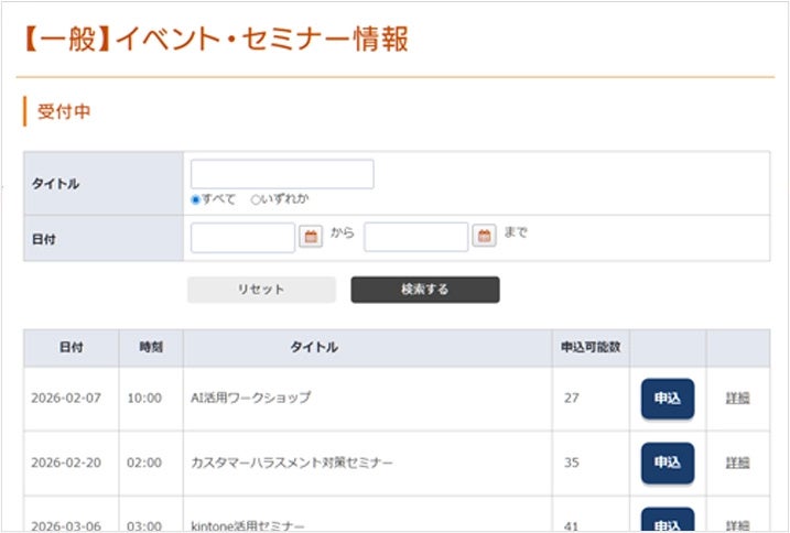 kintoneで登録した内容をWeb上で確認でき、申込を受け付けられます。定員数をアプリで設定することで申込可能数が表示されるため、申し込みがおこなわれるたび残数が減る仕組みとなっています。