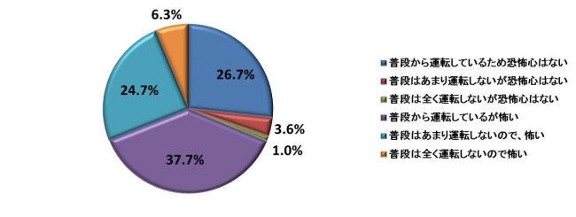 約7割の方が市街地や高速道路の運転について怖いと思っているようです。「怖い」と回答した中でも、「普段から運転しているが怖い」37.7%が最も多い回答となり、市街地や高速道路を運転する頻度が高い人ほど恐怖心を持っていることが分かりました。